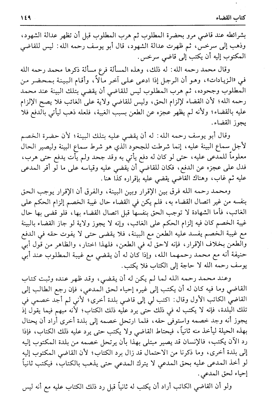 ومحمد رحمه الله فرق بين الإقرار وبين البينة، والفرق أن الإقرار يوجب الحق بنفسه من غير اتصال القضاء به، فلم يكن في القضاء حال غيية الخصم إلزام الحكم على الغائب، فأما الشهادة لا توجب الحق بنفسها قبل اتصال القضاء بها، فلو قضى بها حال غيبة الخصم كان فيه إلزام الحكم على الغائب، وإنه لا يجوز ولاية لو جاز القضاء بالبينة مع غيبة الخصم يفسد عليه الطعن مع البينة، فلا يقضى حتى لا يفوت حقه في الدفع والطعن بخلاف الإقرار، فإنه لاحق له في الطعن، فلهذا اختار، والظاهر من قول أبي حنيفة أنه مع محمد رحمهما الله، وإذا كان له أن يقضي مع غيبة المطلوب عند أبي يوسف رحمه الله لا حاجة إلى الكتاب فلا يكتب.