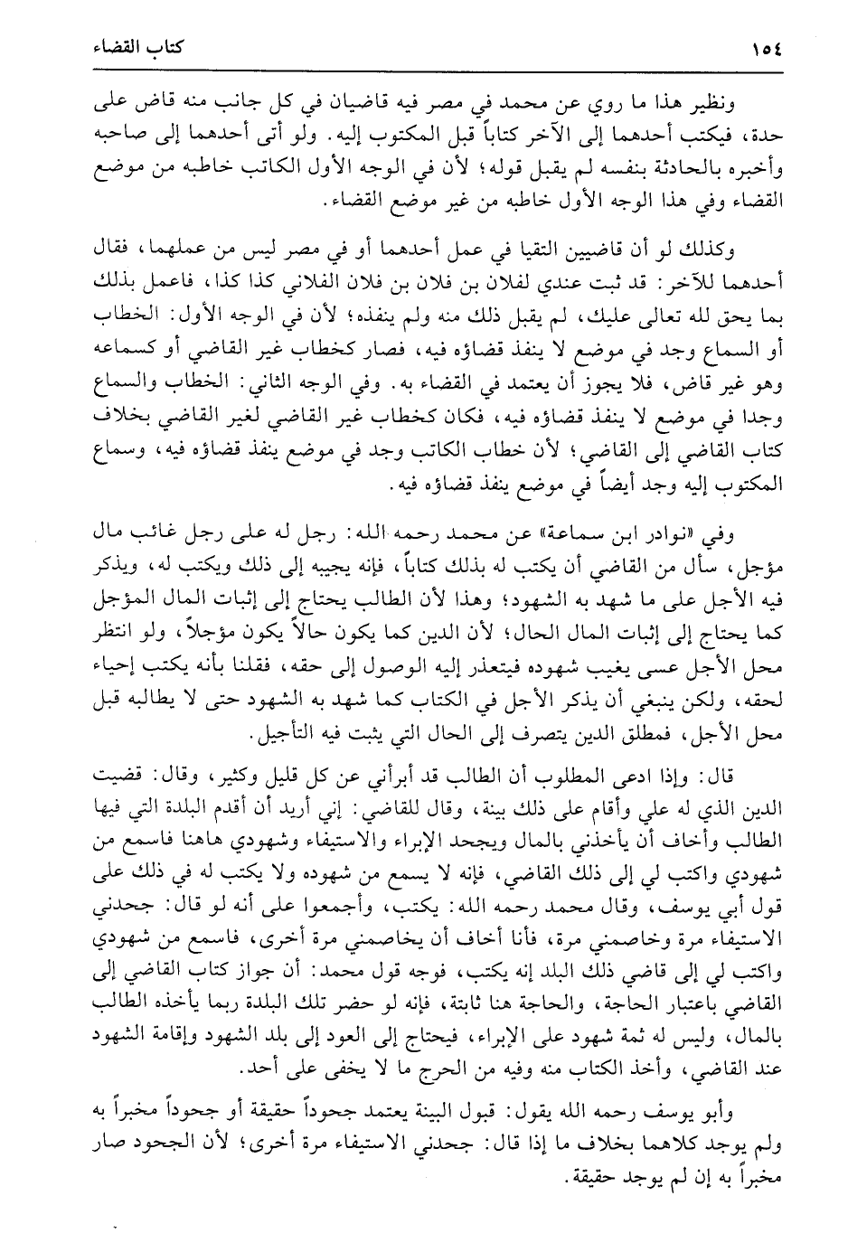 ونظير هذا ما روي عن محمد في مصر فيه قاضيان في كل جانب منه قاض على حدة، فيكتب أحدهما إلى الآخر كتاباً قبل المكتوب إليه. ولو أتى أحدهما إلى صاحبه وأخبره بالحادثة بنفسه لم يقبل قوله؛ لأن في الوجه الأول الكاتب خاطبه من موضع القضاء وفي هذا الوجه الأول خاطبه من غير موضع القضاء.