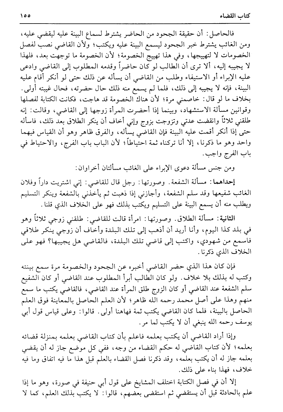 فالحاصل: أن حقيقة الجحود من الحاضر يشترط لسماع البينة عليه ليقضي عليه، ومن الغائب يشترط خبر الجحود ليسمع البينة عليه ويكتب؛ ولأن القاضي نصب لفصل الخصومات لا لتهييجها، وفي هذا تهييج الخصومة؛ لأن الخصومة ما توجهت بعد، فلهذا لا يجيبه إليه، ألا ترى أن الطالب لو كان حاضراً وقدمه المطلوب إلى القاضي وادعى عليه الإبراء أو الاستيفاء وطلب من القاضي أن يسأله عن ذلك حتى لو أنكر أقام عليه البينة، فإنه لا يجيبه إلى ذلك، فلما لم يسمع منه ذلك حال حضرته، فحال غيبته أولى.