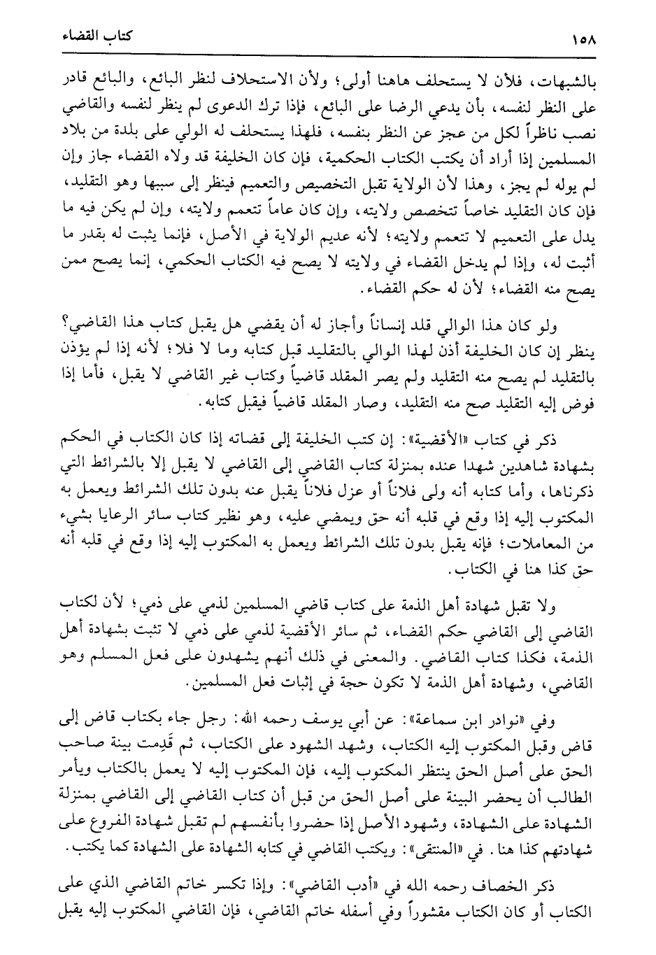 بالشبهات، فلأن لا يستحلف هاهنا أولى؛ ولأن الاستحلاف لنظر البائع، والبائع قادر على النظر لنفسه، بأن يدعي الرضا على البائع، فإذا ترك الدعوى لم ينظر لنفسه والقاضي نصب ناظراً لكل من عجز عن النظر بنفسه، فلهذا يستحلف له الولي على بلدة من بلاد المسلمين إذا أراد أن يكتب الكتاب الحكمية، فإن كان الخليفة قد ولاه القضاء جاز وإن لم يوله لم يجز، وهذا لأن الولاية تقبل التخصيص والتعميم فينظر إلى سببها وهو التقليد، فإن كان التقليد خاصاً تتخصص ولايته، وإن كان عاماً تتعمم ولايته، وإن لم يكن فيه ما يدل على التعميم لا تتعمم ولايته؛ لأنه عديم الولاية في الأصل، فإنما يثبت له بقدر ما أثبت له، وإذا لم يدخل القضاء في ولايته لا يصح فيه الكتاب الحكمي، إنما يصح ممن يصح منه القضاء؛ لأن له حكم القضاء.