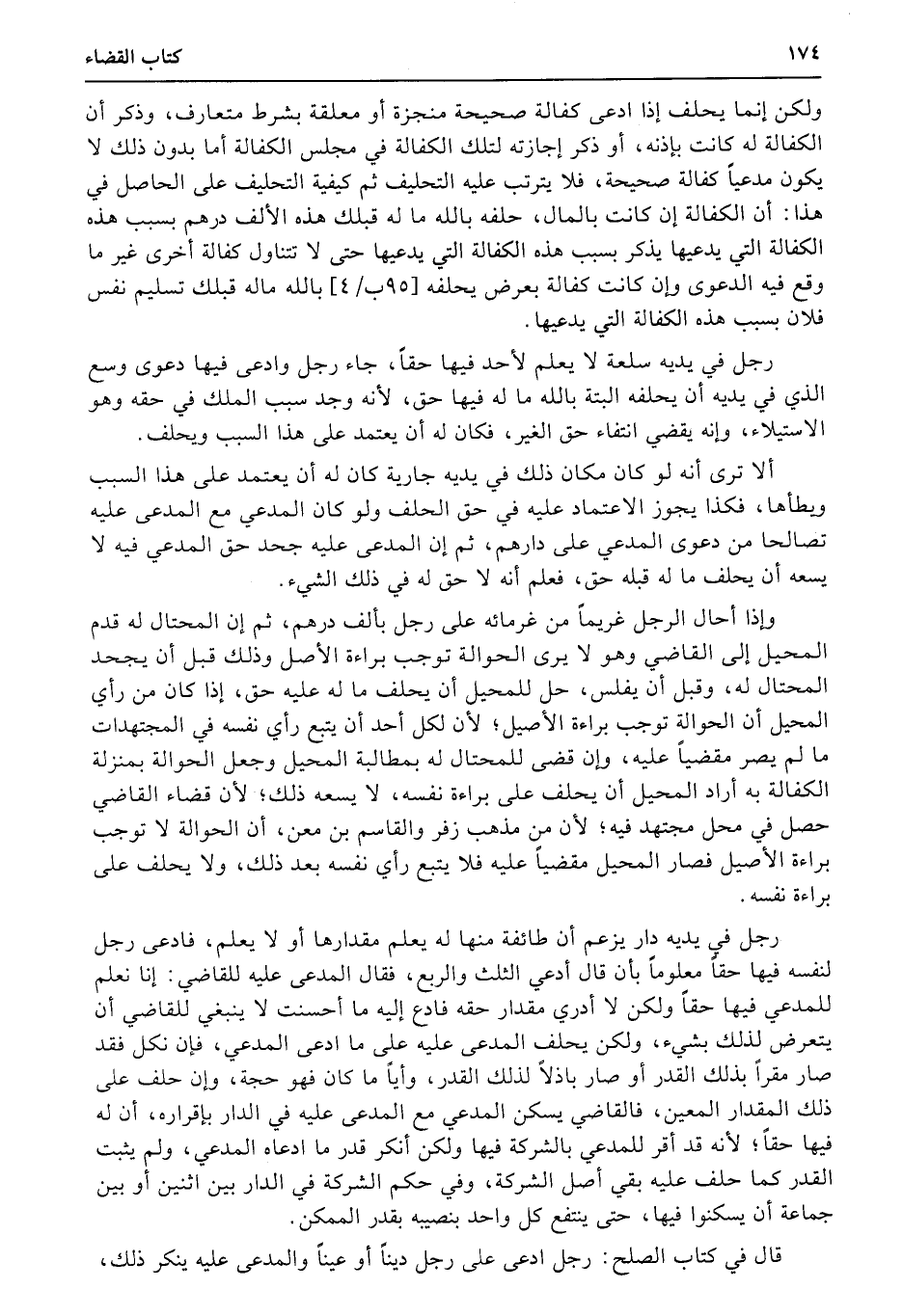 ولكن إنما يحلف إذا ادعى كفالة صحيحة منجزة أو معلقة بشرط متعارف، وذكر أن الكفالة له كانت بإذنه، أو ذكر إجازته لتلك الكفالة في مجلس الكفالة أما بدون ذلك لا يكون مدعياً كفالة صحيحة، فلا يترتب عليه التحليف ثم كيفية التحليف على الحاصل في هذا: أن الكفالة إن كانت بالمال، حلفه بالله ماله قبلك هذه الألف درهم بسبب هذه الكفالة التي يدعيها يذكر بسبب هذه الكفالة التي يدعيها حتى لا تتناول كفالة أخرى غير ما وقع فيه الدعوى وإن كانت كفالة بعرض يحلفه (95ب4) بالله ماله قبلك تسليم نفس فلان بسبب هذه الكفالة التي يدعيها.