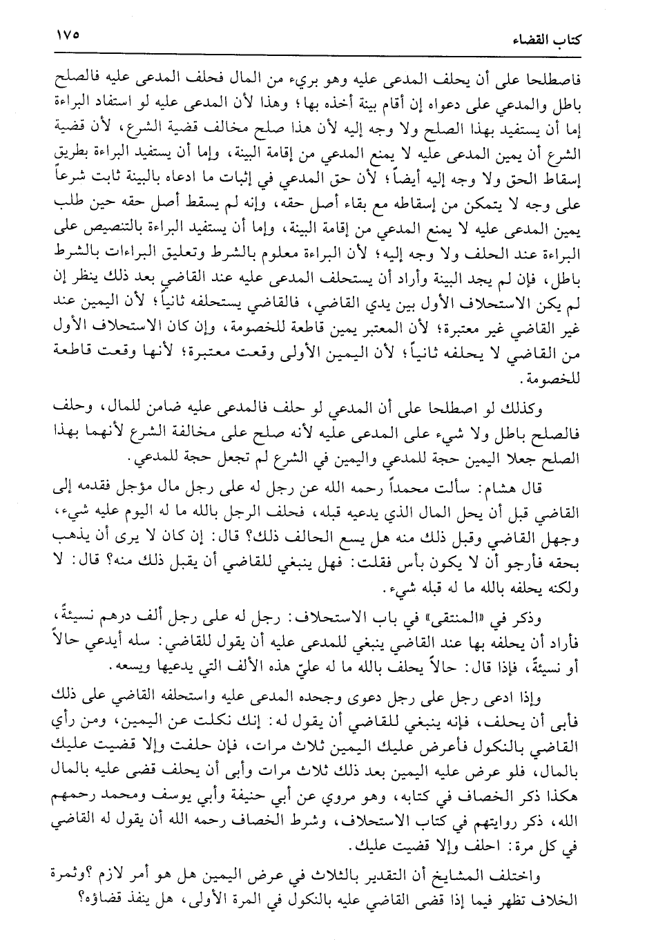 فاصطلحا على أن يحلف المدعى عليه وهو بريء من المال فحلف المدعى عليه فالصلح باطل والمدعي على دعواه إن أقام بينة أخذه بها؛ وهذا لأن المدعى عليه لو استفاد البراءة إما أن يستفيد بهذا الصلح ولا وجه إليه لأن هذا صلح مخالف قضية الشرع، لأن قضية الشرع أن يمين المدعى عليه لا يمنع المدعي من إقامة البينة، وإما أن يستفيد البراءة بطريق إسقاط الحق ولا وجه إليه أيضاً؛ لأن حق المدعي في إثبات ما ادعاه بالبينة ثابت شرعاً على وجه لا يتمكن من إسقاطه مع بقاء أصل حقه، وإنه لم يسقط أصل حقه حين طلب يمين المدعى عليه لا يمنع المدعي من إقامة (البينة) ، وإما أن يستفيد البراءة بالتنصيص على البراءة عند الحلف ولا وجه إليه؛ لأن البراءة معلوم بالشرط وتعليق البراءات بالشرط باطل، فإن لم يجد البينة وأراد أن يستحلف المدعى عليه عند القاضي بعد ذلك ينظر إن لم يكن الاستحلاف الأول بين يدي القاضي، فالقاضي يستحلفه ثانياً؛ لأن اليمين عند غير القاضي غير معتبرة؛ لأن المعتبر يمين قاطعة للخصومة، وإن كان الاستحلاف الأول من القاضي لا يحلفه ثانياً؛ لأن اليمين الأولى وقعت معتبرة؛ لأنها وقعت قاطعة للخصومة.
