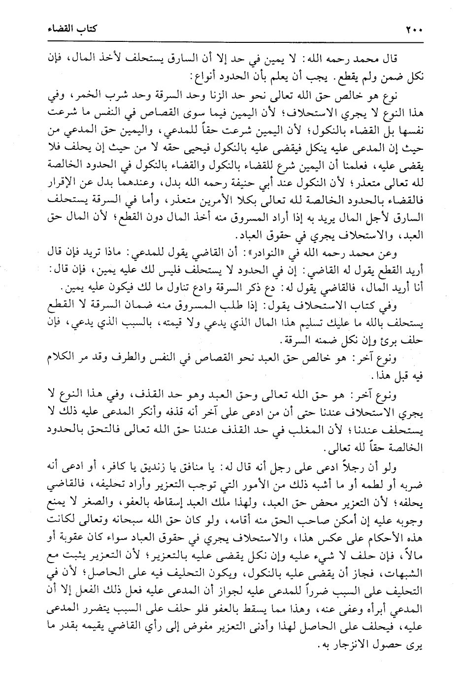 نوع هو خالص حق الله تعالى نحو حد الزنا وحد السرقة وحد شرب الخمر، وفي هذا النوع لا يجري الاستحلاف؛ لأن اليمين فيما سوى القصاص في النفس ما شرعت نفسها بل القضاء بالنكول؛ لأن اليمين شرعت حقاً للمدعي، واليمين حق المدعي من حيث أن المدعى عليه ينكل فيقضى عليه بالنكول فيحيى حقه لا من حيث أن يحلف فلا يقضى عليه، فعلمنا أن اليمين شرع للقضاء بالنكول والقضاء بالنكول في الحدود الخالصة لله تعالى متعذر؛ لأن النكول عند أبي حنيفة رحمه الله بدل، وعندهما بدل عن الإقرار فالقضاء بالحدود الخالصة لله تعالى بكلا الأمرين متعذر، وأما في السرقة يستحلف السارق لأجل المال يريد به إذا أراد المسروق منه أخذ المال دون القطع؛ لأن المال حق العبد، والاستحلاف يجري في حقوق العباد.