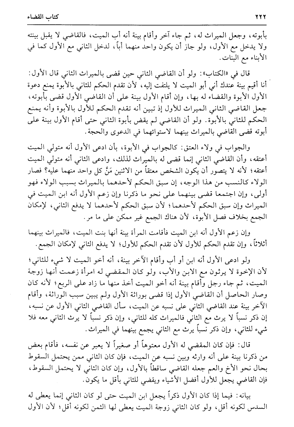 ولو ادعى الأول أنه ابن أو أب وأقام الآخر بينة، أنه أخو الميت لا شيء للثاني؛ لأن الإخوة لا يرثون مع الابن والأب، ولو كان المقضي له امرأة زعمت أنها زوجة الميت، ثم جاء رجل وأقام بينة أنه أخ الميت أخذ منها ما زاد على الربع؛ لأنه كان وصار الحاصل أن القاضي الأول إذا قضى بوراثة الأول ولم يبين سبب الوراثة، وأقام الآخر بينة عند القاضي الثاني على نسبه عن الميت، سأل القاضي الثاني الأول عن نسبه، إن ذكر نسباً لا يرث مع الثاني فالميراث كله للثاني، وإن ذكر نسباً لا يرث الثاني معه فلا شيء للثاني، وإن ذكر نسباً يرث مع الثاني يجمع بينهما في الميراث.