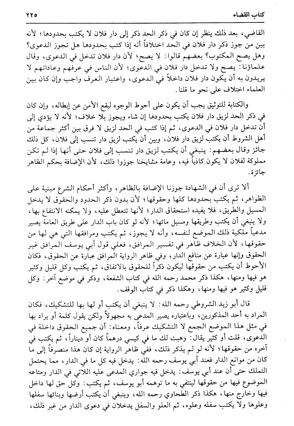 القاضي، بعد ذلك ينظر إن كان في ذكر الحد ذكر إلى دار فلان لا يكتب بحدودها؛ لأنه بين من جوز ذكر دار فلان في الحد اختلافاً أنه إذا كتب بحدودها هل تجوز الدعوى؟ وهل يصح المكتوب؟ بعضهم قالوا: لا يصح؛ لأن دار فلان تدخل في الدعوى، وقال علماؤنا: يصح ولا تدخل دار فلان في الدعوى؛ لأن الناس في عرفهم وعاداتهم لا يريدون به أن يكون دار فلان داخلاً في الدعوى، واعتبار العرف واجب وإن كان بين العلماء اختلاف على نحو ما قلنا.