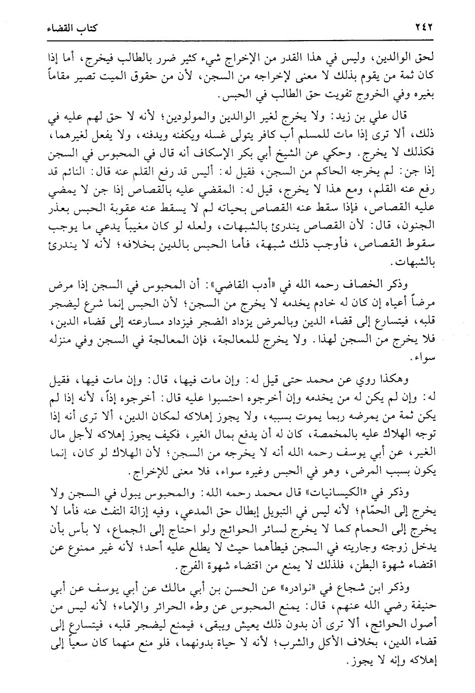 قال علي بن زيد: ولا يخرج لغير الوالدين والمولودين؛ لأنه لا حق لهم عليه في ذلك، ألا ترى إذا مات للمسلم أب كافر يتولى غسله ويكفنه ويدفنه، ولا يفعل لغيرهما، فكذلك لا يخرج. وحكي عن الشيخ أبي بكر الإسكاف أنه قال في المحبوس في السجن إذا جن: لم يخرجه الحاكم من السجن، فقيل له: أليس قد رفع القلم عنه قال: النائم قد رفع عنه القلم، ومع هذا لا يخرج، قيل له: المقضي عليه بالقصاص إذا جن لا يمضي عليه القصاص، فإذا سقط عنه القصاص بحياته لم لا يسقط عنه عقوبة الحبس بعذر الجنون، قال: لأن القصاص يندرئ بالشبهات، ولعله لو كان مغيباً يدعي ما يوجب سقوط القصاص، فأوجب ذلك شبهة، فأما الحبس بالدين بخلافه؛ لأنه لا يندرئ بالشبهات.