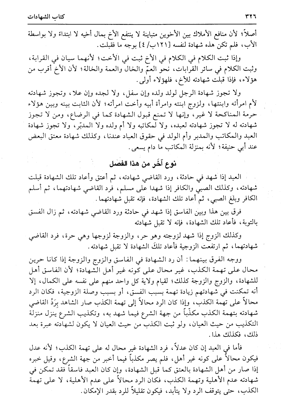 ولا تجوز شهادة الرجل لولد ولده وإن سفل، ولا لجده وإن علا، وتجوز شهادته لأم امرأته وابنتها، ولزوج ابنته وامرأة أبيه وأخت امرأته؛ لأن الثابت بينه وبين هؤلاء حرمة المناكحة لا غير، وإنها لا تمنع قبول الشهادة كما في الرضاع، ومن لا تجوز شهادته له لا تجوز شهادته لعبده، ولا لمكاتبه ولا أم ولده ولا المدبّر، ولا تجوز شهادة العبد والمكاتب والمدبر وأم الولد في حقوق العباد عندنا، وكذلك شهادة معتق البعض عند أبي حنيفة؛ لأنه بمنزلة المكاتب ما دام يسعى.