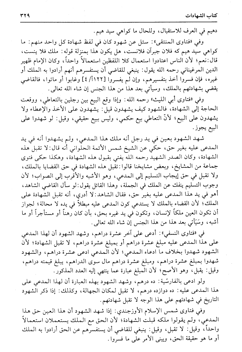 وفي «فتاوى المنتقى» : سئل عن شهود كان في لفظ شهادة كل واحد منهم: ما كواهي سيد هيم كه فلان جبرآن فلانست، هل يكون هذا بمنزلة قوله: ملك فلا ينست، قال: نعم؛ لأن الناس اعتادوا استعمال كلا اللفظين استعمالاً واحداً، وكان الإمام ظهير الدين المرغيناني رحمه الله يقول: ينبغي للقاضي أن يستفسرهم أنهم أرادوا به الملك أو غيره، فإن فسروا أخذ بتفسيرهم، وإن لم يفسروا (122أ4) وغابوا أو ماتوا، فالقاضي يقضي بشهادتهم بالملك، وسيأتي بعد هذا من هذا الجنس إن شاء الله تعالى.
