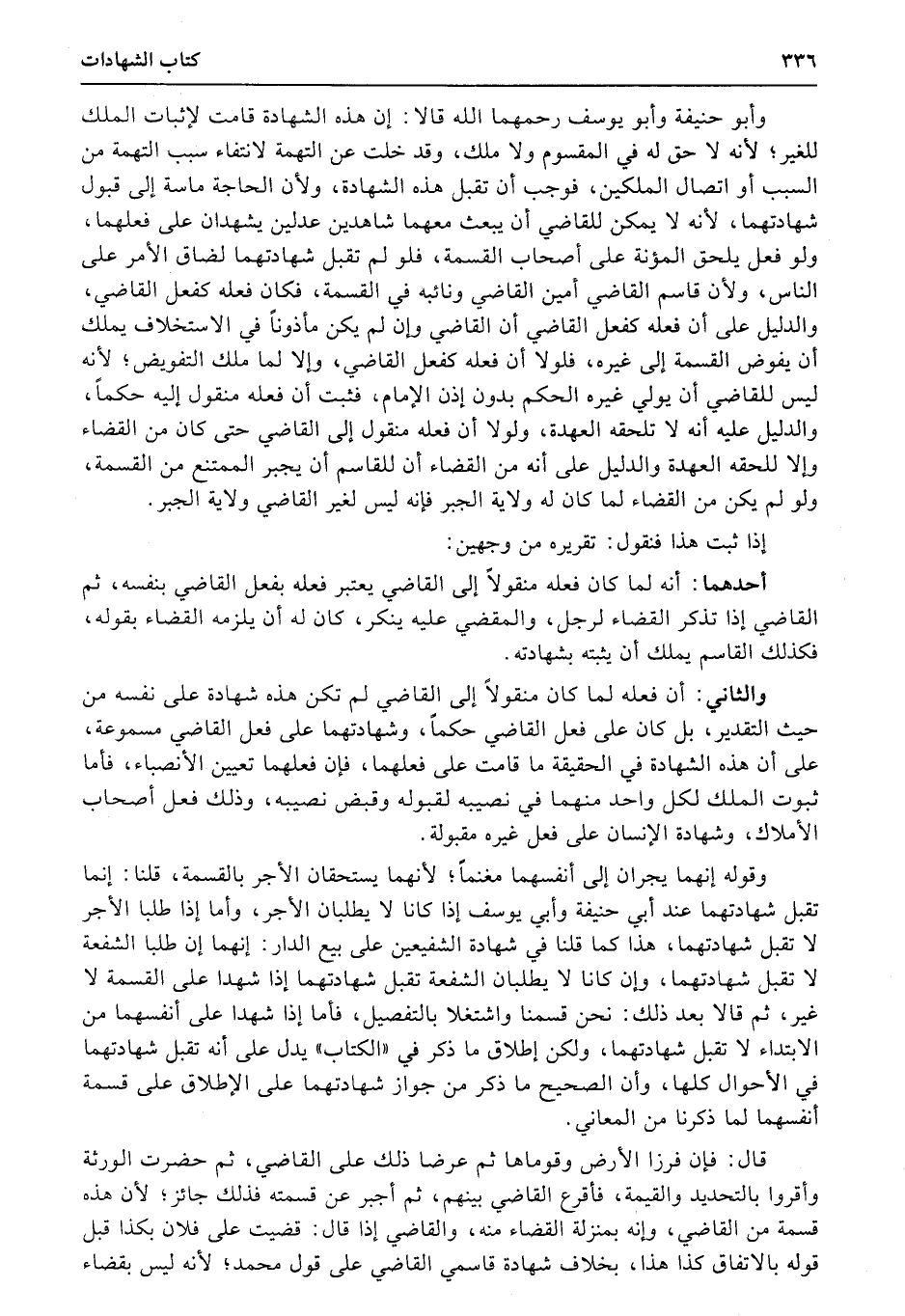 والثاني: أن فعله لما كان منقولاً إلى القاضي لم تكن هذه شهادة على نفسه من حيث التقدير، بل كان على فعل القاضي حكماً، وشهادتهما على فعل القاضي مسموعة، على أن هذه الشهادة في الحقيقة ما قامت على فعلهما، فإن فعلهما تعيين الأنصباء، فأما ثبوت الملك لكل واحد منهما في نصيبه لقبوله وقبض نصيبه، وذلك فعل أصحاب الأملاك، وشهادة الإنسان على فعل غيره مقبولة.