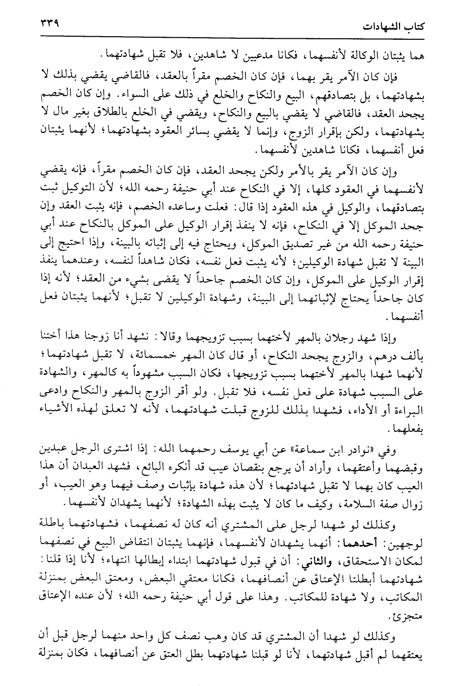 وكذلك لو شهدا لرجل على المشتري أنه كان له نصفهما، فشهادتهما باطلة لوجهين: أحدهما: أنهما يشهدان لأنفسهما، فإنهما يثبتان انتقاض البيع في نصفهما لمكان الاستحقاق، والثاني: أن في قبول شهادتهما ابتداء إبطالها انتهاء؛ لأنا إذا قلنا: شهادتهما أبطلتا الإعتاق عن أنصافهما، فكانا معتقي البعض، ومعتق البعض بمنزلة المكاتب، ولا شهادة للمكاتب. وهذا على قول أبي حنيفة رحمه الله؛ لأن عنده الإعتاق متجزئ.