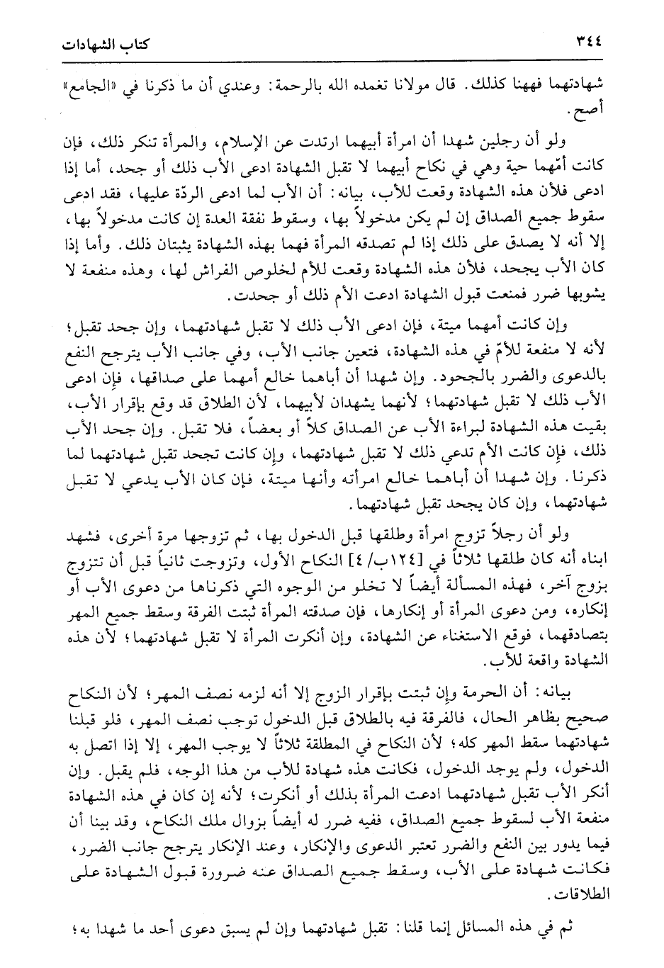 ولو أن رجلين شهدا أن امرأة أبيهما ارتدت عن الإسلام، والمرأة تنكر ذلك، فإن كانت أمّهما حية وهي في نكاح أبيهما لا تقبل الشهادة ادعى الأب ذلك أو جحد، أما إذا ادعى فلأن هذه الشهادة وقعت للأب، بيانه: أن الأب لما ادعى الردّة عليها، فقد ادعى سقوط جميع الصداق إن لم يكن مدخولاً بها، وسقوط نفقة العدة إن كانت مدخولاً بها، إلا أنه لا يصدق على ذلك إذا لم تصدقه المرأة فهما بهذه الشهادة يثبتان ذلك. وأما إذا كان الأب يجحد، فلأن هذه الشهادة وقعت للأم لخلوص الفراش لها، وهذه منفعة لا يشوبها ضرر فمنعت قبول الشهادة ادعت الأم ذلك أو جحدت.