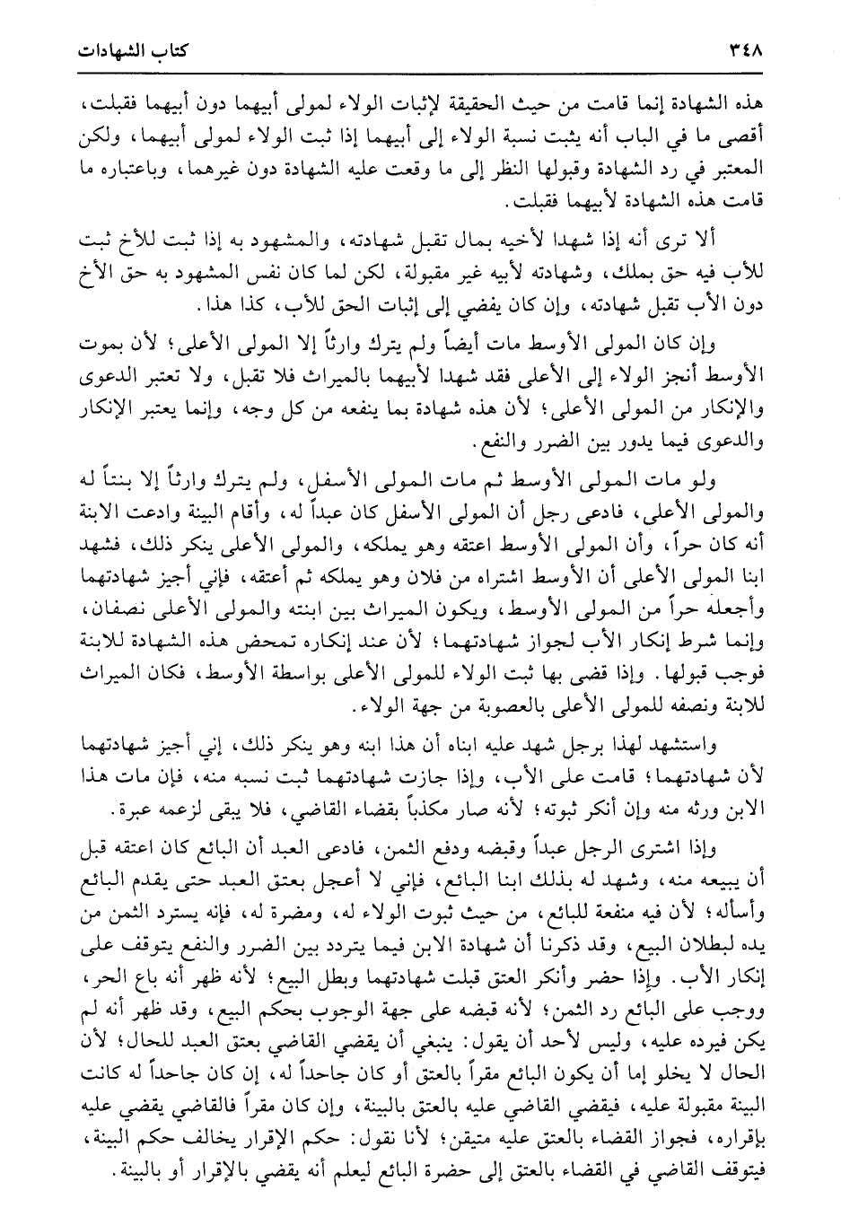 ولو مات المولى الأوسط ثم مات المولى الأسفل، ولم يترك وارثاً إلا ابنتاً له والمولى الأعلى، فادعى رجل أن المولى الأسفل كان عبداً له، وأقام البينة وادعت الابنة أنه كان حراً، وأن المولى الأوسط اعتقه وهو يملكه، والمولى الأعلى ينكر ذلك، فشهد ابنا المولى الأعلى أن الأوسط اشتراه من فلان وهو يملكه ثم أعتقه، فإني أجيز شهادتهما وأجعله حراً من المولى الأوسط، ويكون الميراث بين ابنته والمولى الأعلى نصفان، وإنما شرط إنكار الأب لجواز شهادتهما؛ لأن عند إنكاره تمحض هذه الشهادة للأبنة فوجب قبولها. وإذا قضى بها ثبت الولاء للمولى الأعلى بواسطة الأوسط، فكان الميراث للابنة ونصفه للمولى الأعلى بالعصوبة من جهة الولاء.