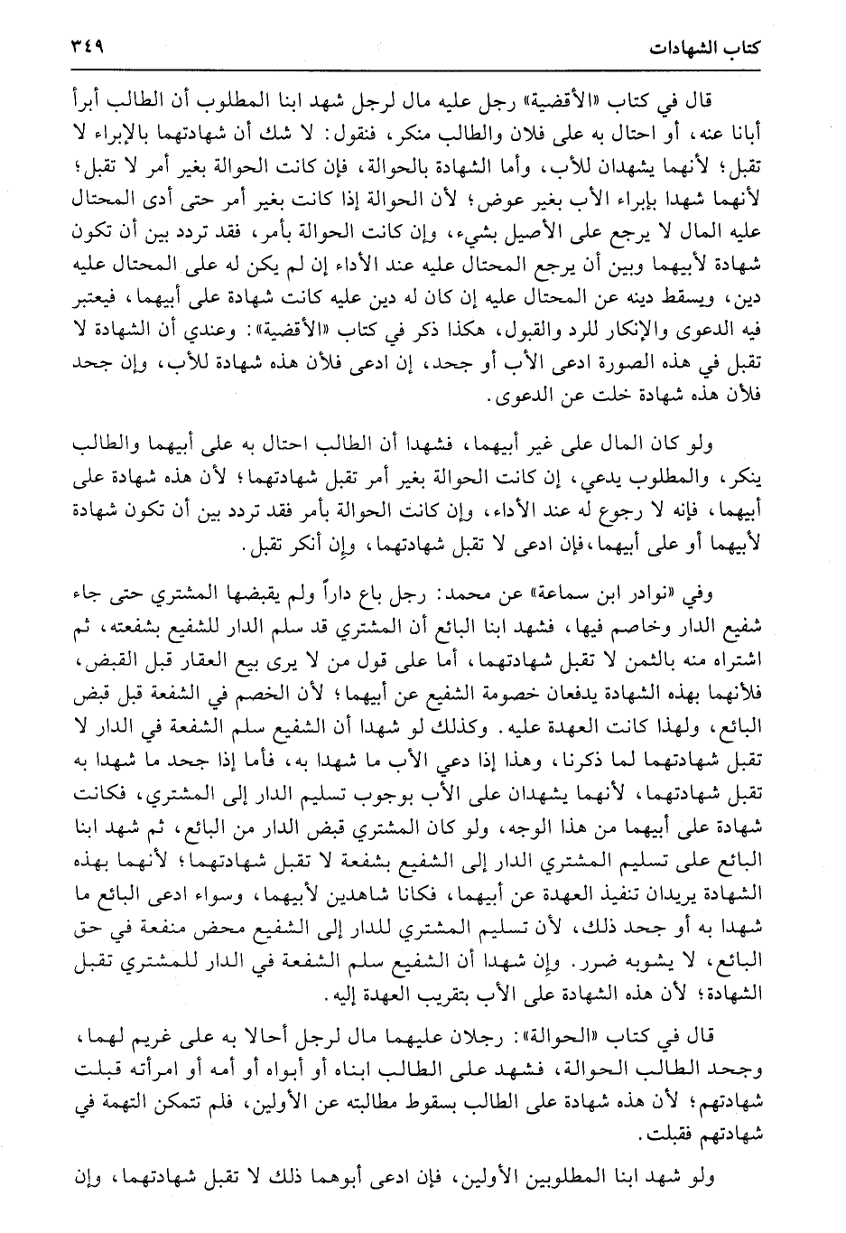 قال في كتاب «الأقضية» رجل عليه مال لرجل شهد ابنا المطلوب أن الطالب أبرأ أبانا عنه، أو احتال به على فلان والطالب منكر، فنقول: لا شك أن شهادتهما بالإبراء لا تقبل؛ لأنهما يشهدان للأب، وأما الشهادة بالحوالة، فإن كانت الحوالة بغير أمر لا تقبل؛ لأنهما شهدا بإبراء الأب بغير عوض؛ لأن الحوالة إذا كانت بغير أمر حتى أدى المحتال عليه المال لا يرجع على الأصيل بشيء، وإن كانت الحوالة بأمر، فقد تردد بين أن تكون شهادة لأبيهما وبين (حيث) أن يرجع المحتال عليه عند الأداء إن لم يكن له على المحتال عليه دين، ويسقط دينه عن المحتال عليه إن كان له دين عليه كانت شهادة على أبيهما، فيعتبر فيه الدعوى والإنكار للرد والقبول، هكذا ذكر في كتاب «الأقضية» : وعندي أن الشهادة لا تقبل في هذه الصورة ادعى الأب أو جحد، إن ادعى فلأن هذه شهادة للأب، وإن جحد فلأن هذه شهادة خلت عن الدعوى.