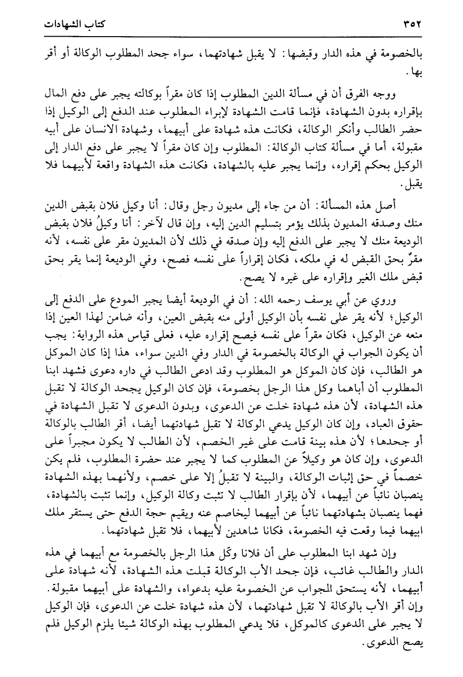 ووجه الفرق أن في مسألة الدين المطلوب إذا كان مقراً بوكالته يجبر على دفع المال بإقراره بدون الشهادة، فإنما قامت الشهادة لإبراء المطلوب عند الدفع إلى الوكيل إذا حضر الطالب وأنكر الوكالة، فكانت هذه شهادة على أبيهما، وشهادة الانسان على أبيه مقبولة، أما في مسألة كتاب الوكالة: المطلوب وإن كان مقراً لا يجبر على دفع الدار إلى الوكيل بحكم إقراره، وإنما يجبر عليه بالشهادة، فكانت هذه الشهادة واقعة لأبيهما فلا يقبل.