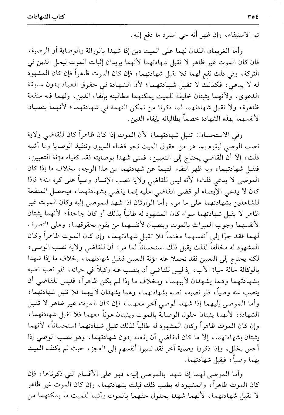 وفي الاستحسان: تقبل شهادتهما؛ لأن الموت إذا كان ظاهراً كان للقاضي ولاية نصب الوصي ليقوم بما هو من حقوق الميت نحو قضاء الديون وتنفيذ الوصايا وما أشبه ذلك، إلا أن القاضي يحتاج إلى التعيين، فمتى شهدا بوصايته فقد كفياه مؤنة التعيين، فتقبل شهادتهما، وبه ظهر انتفاء التهمة عن شهادتهما من هذا الوجه، بخلاف ما إذا كان الموصى لا يدعي ذلك؛ لأنه ليس للقاضي ولاية نصب الإنسان وصياً على كره منه؛ فإذا كان لا يدعي الإيصاء لو قضى القاضي عليه إنما يقضي بشهادتهما، فيحصل المنفعة للشاهدين بشهادتهما على ما مر، وأما الوارثان إذا شهد للموصى إليه وكان الموت غير ظاهر لا يقبل شهادتهما سواء كان المشهود له طالباً بذلك أو كان جاحداً؛ لأنهما يثبتان لأنفسهما وجوب الميراث بالموت وينصبان لأنفسهما من يقوم بحقوقهما، وعلى التصرف لهما فقد جرّا إلى أنفسهما مغنماً فلا تقبل شهادتهما، وإن كان الموت ظاهراً وكان المشهود له مخالفاً لذلك يقبل ذلك استحساناً لما مر: أن للقاضي ولاية نصب الوصي، لكنه يحتاج إلى التعيين فقد تحملا عنه مؤنة التعيين فيقبل شهادتهما، بخلاف ما إذا شهدا بالوكالة حالة حياة الأب، إذ ليس للقاضي أن ينصب عنه وكيلاً في حياته، فلو نصبه نصبه بشهادتهما وهما يشهدان لأبيهما، وبخلاف ما إذا لم يكن ظاهراً، فليس للقاضي أن ينصب عنه وصياً، فلو نصبه، نصبه بشهادتهما، وهما يشهدان لأبيهما فلا تقبل شهادتهما، وأما الموصى إليهما إذا شهدا لوصي آخر معهما، فإن كان الموت غير ظاهر لا تقبل الشهادة؛ لأنهما يثبتان حلول الوصاية بالموت ويثبتان عوناً معهما فلا تقبل شهادتهما، وإن كان الموت ظاهراً وكان المشهود له طالباً لذلك تقبل شهادتهما استحساناً، لأنهما يثبتان بشهادتهما، إلا ما كان للقاضي أن يفعله بدون شهادتهما، وهو نصب الوصي إذا أحس بخلل، وإذا ذكروا وصاية آخر فقد نسبوا أنفسهم إلى العجز، حيث لم يكتف الميت بهما وصياً، فيقبل شهادتهما.