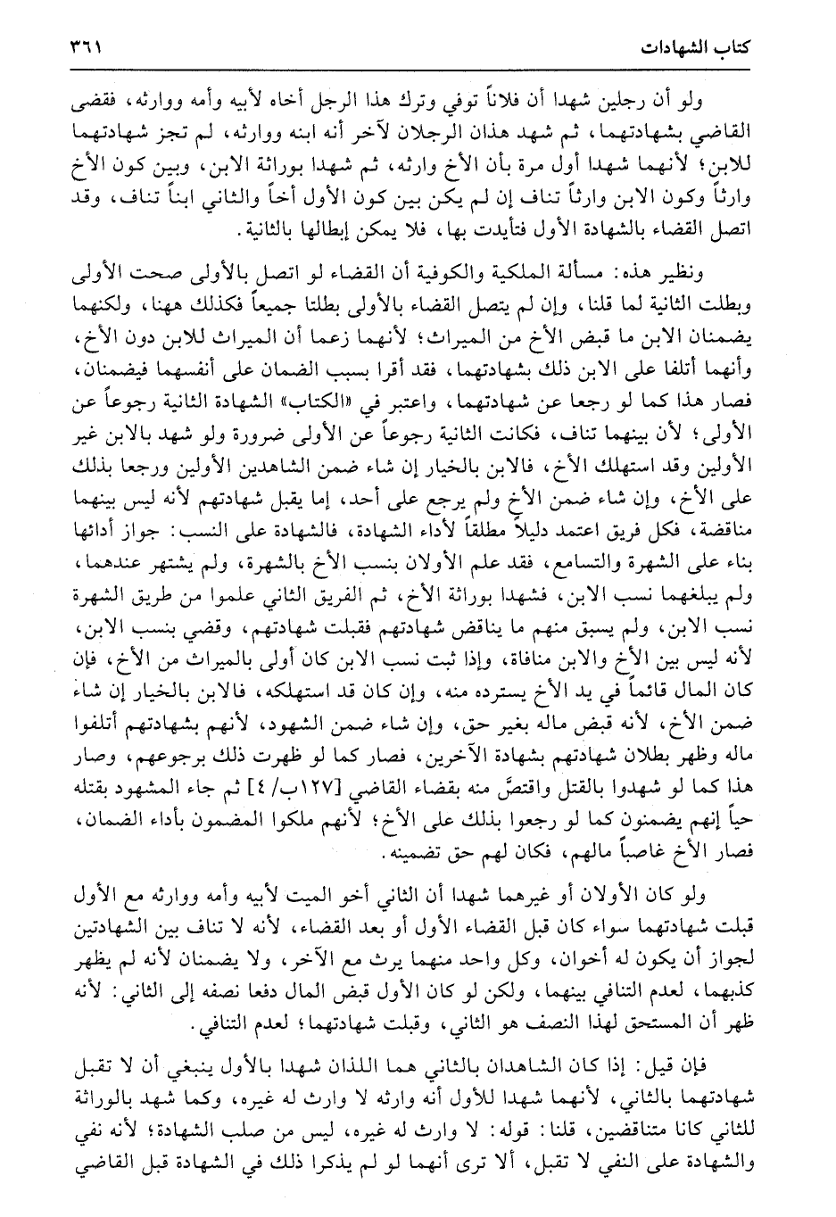 ونظير هذه: مسألة الملكية والكوفية أن القضاء لو اتصل بالأولى صحت الأولى وبطلت الثانية لما قلنا، وإن لم يتصل القضاء بالأولى بطلتا جميعاً فكذلك ههنا، ولكنهما يضمنان الابن ما قبض الأخ من الميراث؛ لأنهما زعما أن الميراث للابن دون الأخ، وأنهما أتلفا على الابن ذلك بشهادتهما، فقد أقرا بسبب الضمان على أنفسهما فيضمنان، فصار هذا كما لو رجعا عن شهادتهما، واعتبر في «الكتاب» الشهادة الثانية رجوعاً عن الأولى؛ لأن بينهما تناف، فكانت الثانية رجوعاً عن الأولى ضرورة ولو شهد بالابن غير الأولين وقد استهلك الأخ، فالابن بالخيار إن شاء ضمن الشاهدين الأولين ورجعا بذلك على الأخ، وإن شاء ضمن الأخ ولم يرجع على أحد، إما يقبل شهادتهم لأنه ليس بينهما مناقضة، فكل فريق اعتمد دليلاً مطلقاً لأداء الشهادة، فالشهادة على النسب: جواز أدائها بناء على الشهرة والتسامع، فقد علم الأولان بنسب الأخ بالشهرة، ولم يشتهر عندهما، ولم يبلغهما نسب الابن، فشهدا بوراثة الأخ، ثم الفريق الثاني علموا من طريق الشهرة نسب الابن، ولم يسبق منهم ما يناقض شهادتهم فقبلت شهادتهم، وقضي بنسب الابن، لأنه ليس بين الأخ والابن منافاة، وإذا ثبت نسب الابن كان أولى بالميراث من الأخ، فإن كان المال قائماً في يد الأخ يسترده منه، وإن كان قد استهلكه، فالابن بالخيار إن شاء ضمن الأخ، لأنه قبض ماله بغير حق، وإن شاء ضمن الشهود، لأنهم بشهادتهم أتلفوا ماله وظهر بطلان شهادتهم بشهادة الآخرين، فصار كما لو ظهرت ذلك برجوعهم، وصار هذا كما لو شهدوا بالقتل واقتصَّ منه بقضاء القاضي (127ب4) ثم جاء المشهود بقتله حياً إنهم يضمنون كما لو رجعوا بذلك على الأخ؛ لأنهم ملكوا المضمون بأداء الضمان، فصار الأخ غاصباً مالهم، فكان لهم حق تضمينه.