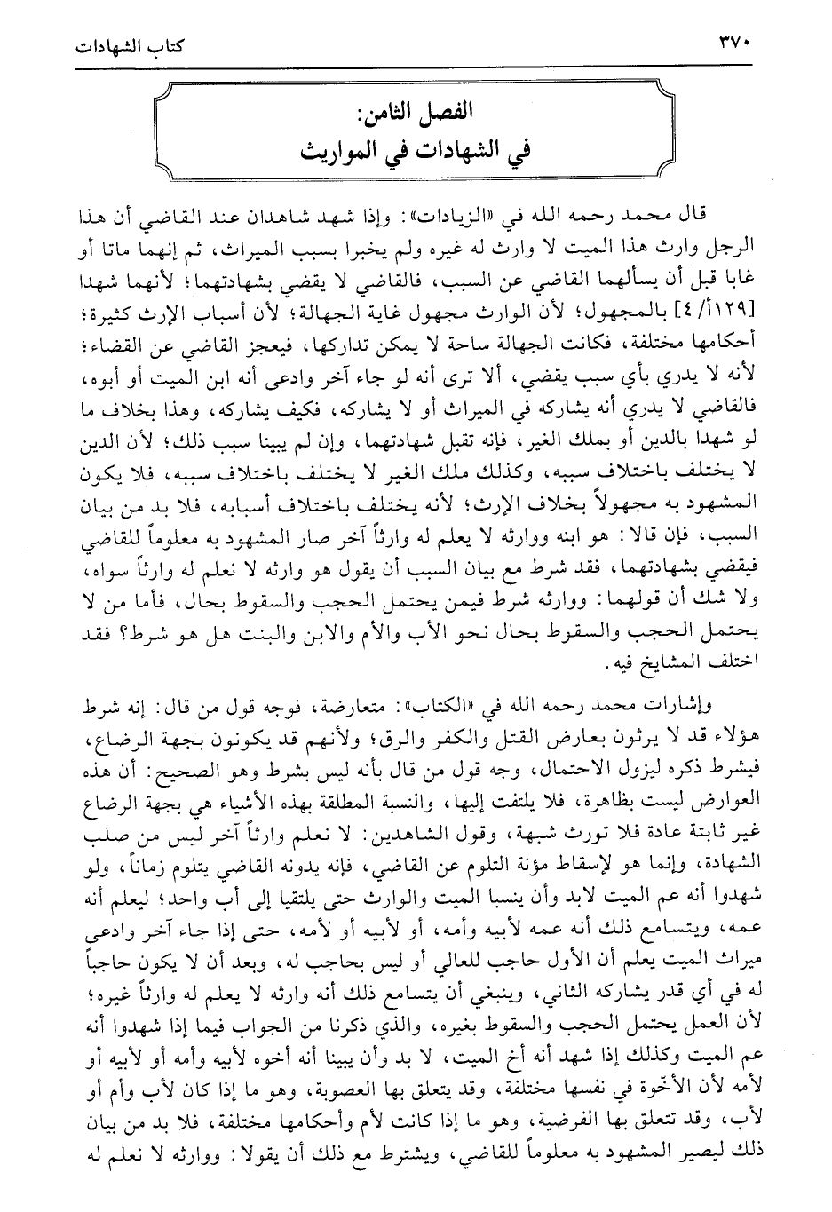 وإشارات محمد رحمه الله في «الكتاب» : متعارضة، فوجه قول من قال: إنه شرط هؤلاء قد لا يرثون بعارض القتل والكفر والرق؛ ولأنهم قد يكونون بجهة الرضاع، فيشرط ذكره ليزول الاحتمال، وجه قول من قال بأنه ليس بشرط وهو الصحيح: أن هذه العوارض ليست بظاهرة، فلا يلتفت إليها، والنسبة المطلقة بهذه الأشياء هي بجهة الرضاع غير ثابتة عادة فلا تورث شبهة، وقول الشاهدين: لا نعلم وارثاً آخر ليس من صلب الشهادة، وإنما هو لإسقاط مؤنة التلوم عن القاضي، فإنه يدونه القاضي يتلوم زماناً، ولو شهدوا أنه عم الميت لابد وأن ينسبا الميت والوارث حتى يلتقيا إلى أب واحد؛ ليعلم أنه عمه، ويتسامع ذلك أنه عمه لأبيه وأمه، أو لأبيه أو لأمه، حتى إذا جاء آخر وادعى ميراث الميت يعلم أن الأول حاجب للعالي أو ليس بحاجب له، وبعد أن لا يكون حاجباً له في أي قدر يشاركه الثاني، وينبغي أن يتسامع ذلك أنه وارثه لا يعلم له وارثاً غيره؛ لأن العمل يحتمل الحجب والسقوط بغيره، والذي ذكرنا من الجواب فيما إذا شهدوا أنه عم الميت وكذلك إذا شهد أنه أخ الميت، لا بد وأن يبينا أنه أخوه لأبيه وأمه أو لأبيه أو لأمه لأن الأخّوة في نفسها مختلفة، وقد يتعلق بها العصوبة، وهو ما إذا كان لأب وأم أو لأب، وقد تتعلق بها الفرضية، وهو ما إذا كانت لأم وأحكامها مختلفة، فلا بد من بيان ذلك ليصير المشهود به معلوماً للقاضي، ويشترط مع ذلك أن يقولا ووارثه: لا نعلم له
