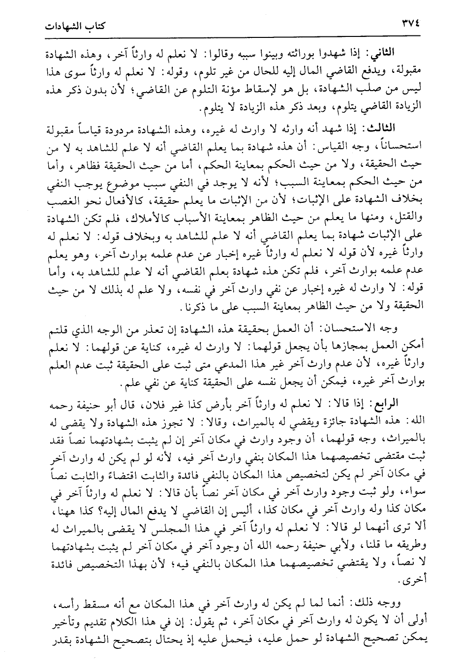 الثالث: إذا شهد أنه وارثه لا وارث له غيره، وهذه الشهادة مردودة قياساً مقبولة استحساناً، وجه القياس: أن هذه شهادة بما يعلم القاضي أنه لا علم للشاهد به لا من حيث الحقيقة، ولا من حيث الحكم بمعاينة الحكم، أما من حيث الحقيقة فظاهر، وأما من حيث الحكم بمعاينة السبب؛ لأنه لا يوجد في النفي سبب موضوع يوجب النفي بخلاف الشهادة على الإثبات؛ لأن من الإثبات ما يعلم حقيقة، كالأفعال نحو الغصب والقتل، ومنها ما يعلم من حيث الظاهر بمعاينة الأسباب كالأملاك، فلم تكن الشهادة على الإثبات شهادة بما يعلم القاضي أنه لا علم للشاهد به وبخلاف قوله: لا نعلم له وارثاً غيره لأن قوله لا نعلم له وارثاً غيره إخبار عن عدم علمه بوارث آخر، وهو يعلم عدم علمه بوارث آخر، فلم تكن هذه شهادة بعلم القاضي أنه لا علم للشاهد به، وأما قوله: لا وارث له غيره إخبار عن نفي وارث آخر في نفسه، ولا علم له بذلك لا من حيث الحقيقة ولا من حيث الظاهر بمعاينة السبب على ما ذكرنا.