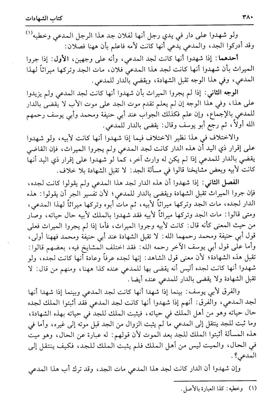 الوجه الثاني: إذا لم يجروا الميراث بأن شهدوا أنها كانت لجد المدعي ولم يزيدوا على هذا، وفي هذا الوجه إن لم يعلم تقدم موت الجد على موت الأب لا يقضى بالدار للمدعي بالإجماع، وإن علم فكذلك الجواب عند أبي حنيفة ومحمد وأبي يوسف رحمهم الله أولاً، ثم رجع أبو يوسف وقال: يقضى بالدار للمدعي.