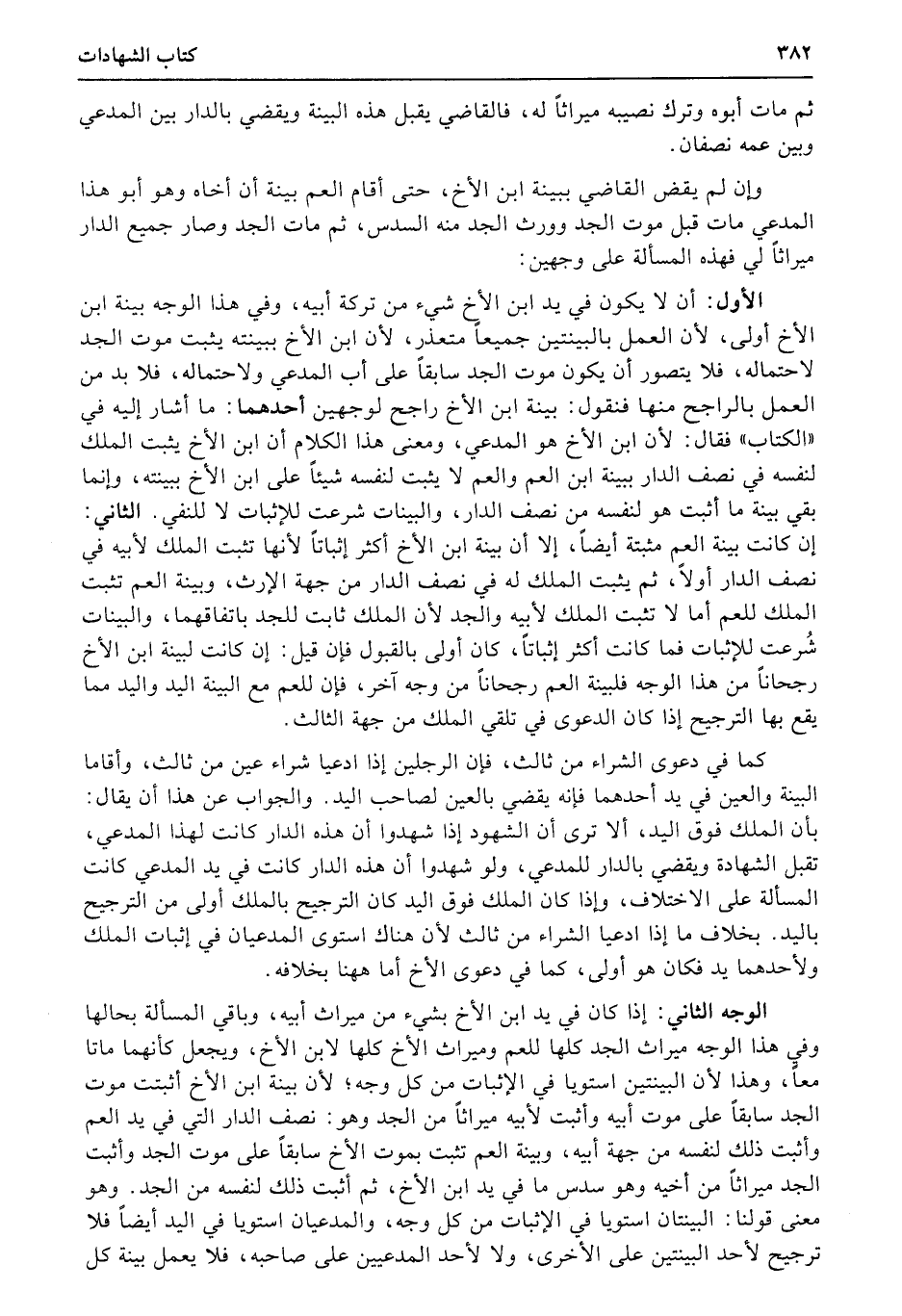 الأول: أن لا يكون في يد ابن الأخ شيء من تركة أبيه، وفي هذا الوجه بينة ابن الأخ أولى، لأن العمل بالبينتين جميعاً متعذر، لأن ابن الأخ ببينته يثبت موت الجد لاحتماله، فلا يتصور أن يكون موت الجد سابقاً على أب المدعي ولاحتماله، فلا بد من العمل بالراجح منها فنقول: بينة ابن الأخ راجح لوجهين أحدهما: ما أشار إليه في «الكتاب» فقال: لأن ابن الأخ هو المدعي، ومعنى هذا الكلام أن ابن الأخ يثبت الملك لنفسه في نصف الدار ببينة ابن العم والعم لا يثبت لنفسه شيئاً على ابن الأخ ببينته، وإنما بقي بينة ما أثبت هو لنفسه من نصف الدار، والبينات شرعت للإثبات لا للنفي. الثاني: إن كانت بينة العم مثبتة أيضاً، إلا أن بينة ابن الأخ أكثر إثباتاً لأنها تثبت الملك لأبيه في نصف الدار أولاً، ثم يثبت الملك له في نصف الدار من جهة الإرث، وبينة العم تثبت الملك للعم أما لا تثبت الملك لأبيه والجد لأن الملك ثابت للجد باتفاقهما، والبينات شُرعت للإثبات فما كانت أكثر إثباتاً، كان أولى بالقبول فإن قيل: إن كانت لبينة ابن الأخ رجحاناً من هذا الوجه فلبينة العم رجحاناً من وجه آخر، فإن للعم مع البينة اليد واليد مما يقع بها الترجيح إذا كان الدعوى في تلقي الملك من جهة الثالث.