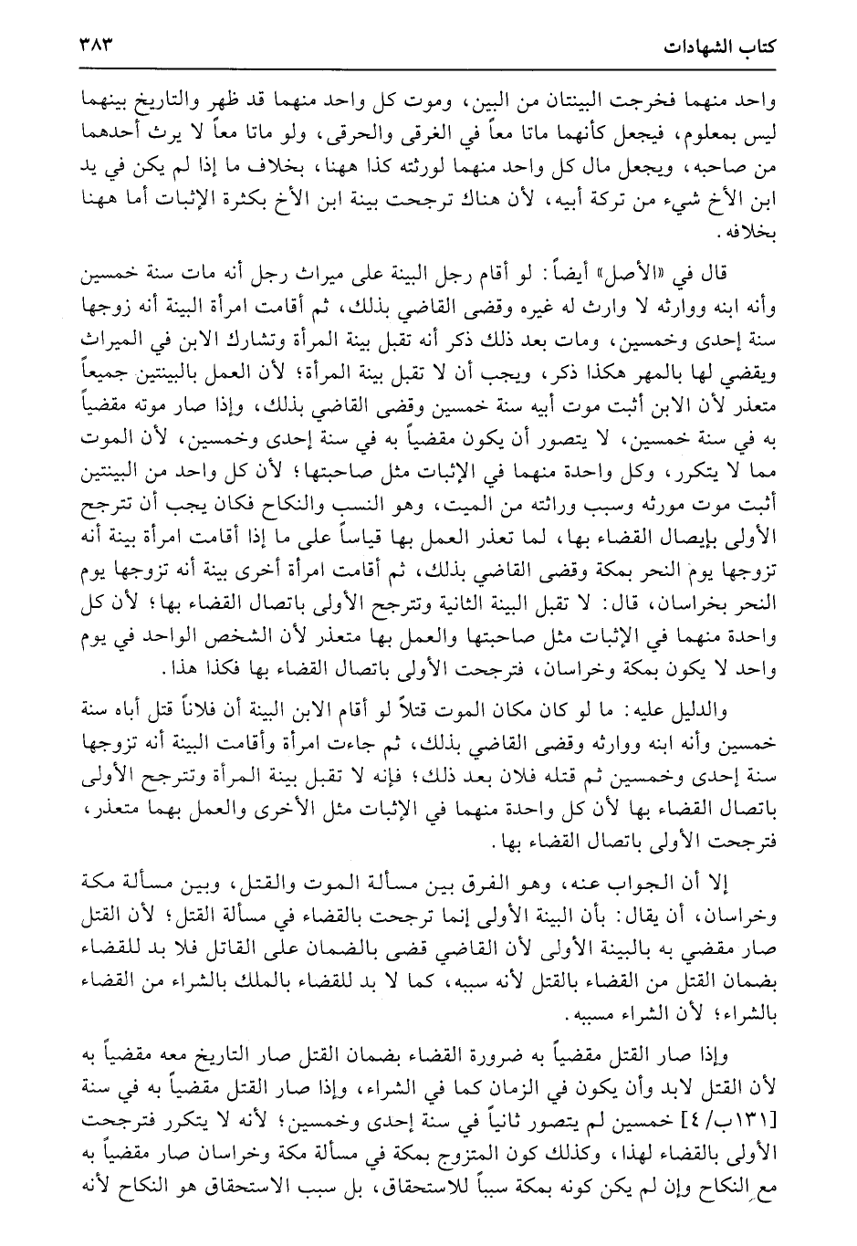 وإذا صار القتل مقضياً به ضرورة القضاء بضمان القتل صار التاريخ معه مقضياً به لأن القتل لابد وأن يكون في الزمان كما في الشراء، وإذا صار القتل مقضياً به في سنة (131ب4) خمسين لم يتصور ثانياً في سنة إحدى وخمسين؛ لأنه لا يتكرر فترجحت الأولى بالقضاء لهذا، وكذلك كون المتزوج بمكة في مسألة مكة وخراسان صار مقضياً به مع النكاح وإن لم يكن كونه بمكة سبباً للاستحقاق، بل سبب الاستحقاق هو النكاح لأنه
