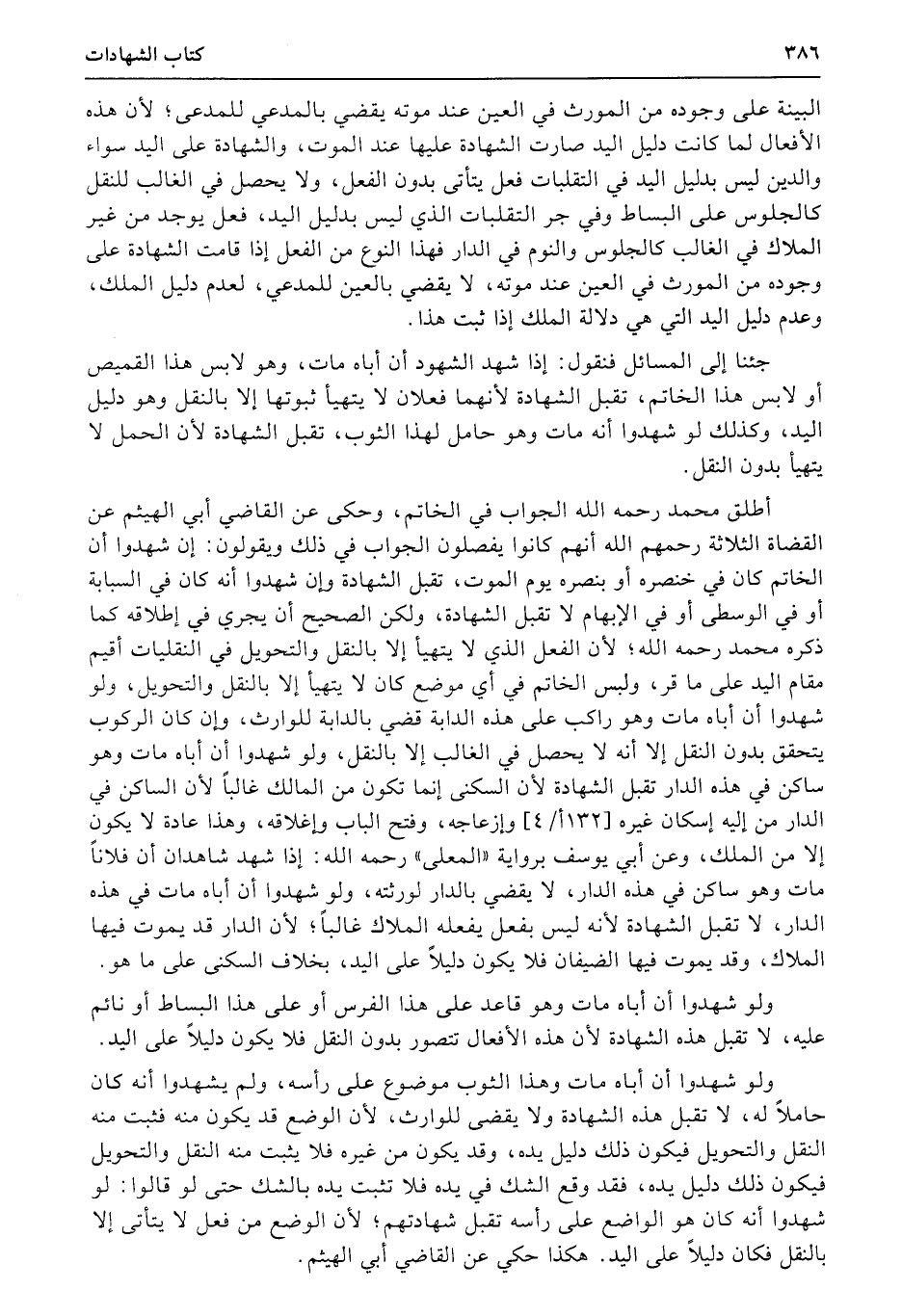 جئنا إلى المسائل فنقول: إذا شهد الشهود أن أباه مات، وهو لابس هذا القميص أو لابس هذا الخاتم، تقبل الشهادة لأنهما فعلان لا يتهيأ ثبوتها إلا بالنقل وهو دليل اليد، وكذلك لو شهدوا أنه مات وهو حامل لهذا الثوب، تقبل الشهادة لأن الحمل لا يتهيأ بدون النقل.
