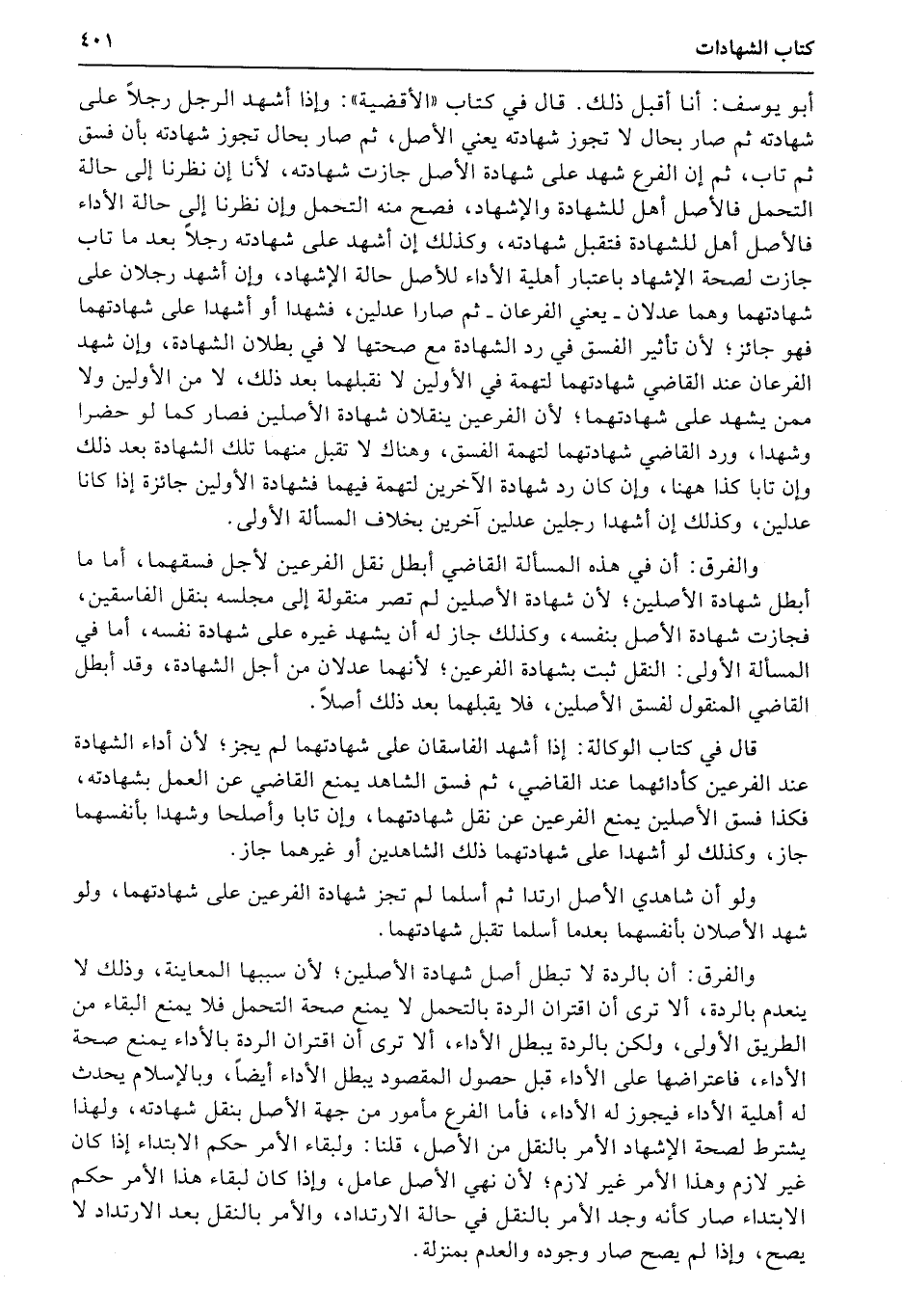 أبو يوسف: أنا أقبل ذلك. قال في كتاب «الأقضية» : وإذا أشهد الرجل رجلاً على شهادته ثم صار بحال لا تجوز شهادته يعني الأصل، ثم صار بحال تجوز شهادته بأن فسق ثم تاب، ثم إن الفرع شهد على شهادة الأصل جازت شهادته، لأنا إن نظرنا إلى حالة التحمل فالأصل أهل للشهادة والإشهاد، فصح منه التحمل وإن نظرنا إلى حالة الأداء فالأصل أهل للشهادة فتقبل شهادته، وكذلك إن أشهد على شهادته رجلاً بعد ما تاب جازت لصحة الإشهاد باعتبار أهلية الأداء للأصل حالة الإشهاد، وإن أشهد رجلان على شهادتهما وهما عدلان * يعني الفرعان * ثم صارا عدلين، فشهدا أو أشهدا على شهادتهما فهو جائز؛ لأن تأثير الفسق في رد الشهادة مع صحتها لا في بطلان الشهادة، وإن شهد الفرعان عند القاضي شهادتهما لتهمة في الأولين لا نقبلهما بعد ذلك، لا من الأولين ولا ممن يشهد على شهادتهما؛ لأن الفرعين ينقلان شهادة الأصلين فصار كما لو حضرا وشهدا، ورد القاضي شهادتهما لتهمة الفسق، وهناك لا تقبل منهما تلك الشهادة بعد ذلك وإن تابا كذا ههنا، وإن كان رد شهادة الآخرين لتهمة فيهما فشهادة الأولين جائزة إذا كانا عدلين، وكذلك إن أشهدا رجلين عدلين آخرين بخلاف المسألة الأولى.