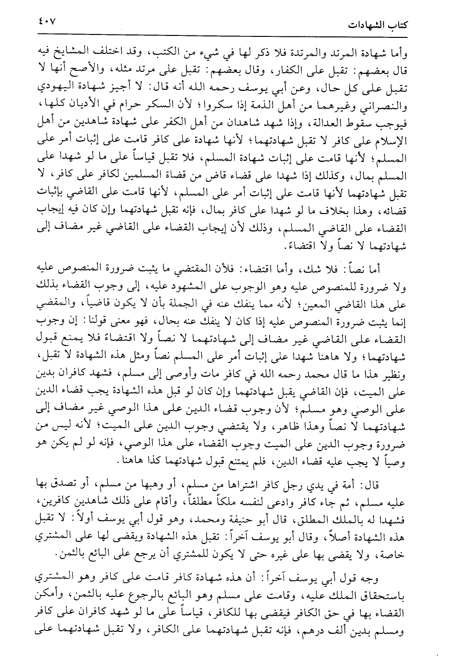 وأما شهادة المرتد والمرتدة فلا ذكر لها في شيء من الكتب، وقد اختلف المشايخ فيه قال بعضهم: تقبل على الكفار، وقال بعضهم: تقبل على مرتد مثله، والأصح أنها لا تقبل على كل حال، وعن أبي يوسف رحمه الله أنه قال: لا أجيز شهادة اليهودي والنصراني وغيرهما من أهل الذمة إذا سكروا؛ لأن السكر حرام في الأديان كلها، فيوجب سقوط العدالة، وإذا شهد شاهدان من أهل الكفر على شهادة شاهدين من أهل الإسلام على كافر لا تقبل شهادتهما؛ لأنها شهادة على كافر قامت على إثبات أمر على المسلم؛ لأنها قامت على إثبات شهادة المسلم، فلا تقبل قياساً على ما لو شهدا على المسلم بمال، وكذلك إذا شهدا على قضاء قاض من قضاة المسلمين لكافر على كافر، لا تقبل شهادتهما لأنها قامت على إثبات أمر على المسلم، لأنها قامت على القاضي بإثبات قضائه، وهذا بخلاف ما لو شهدا على كافر بمال، فإنه تقبل شهادتهما وإن كان فيه إيجاب القضاء على القاضي المسلم، وذلك لأن إيجاب القضاء على القاضي غير مضاف إلى شهادتهما لا نصاً ولا اقتضاءً.