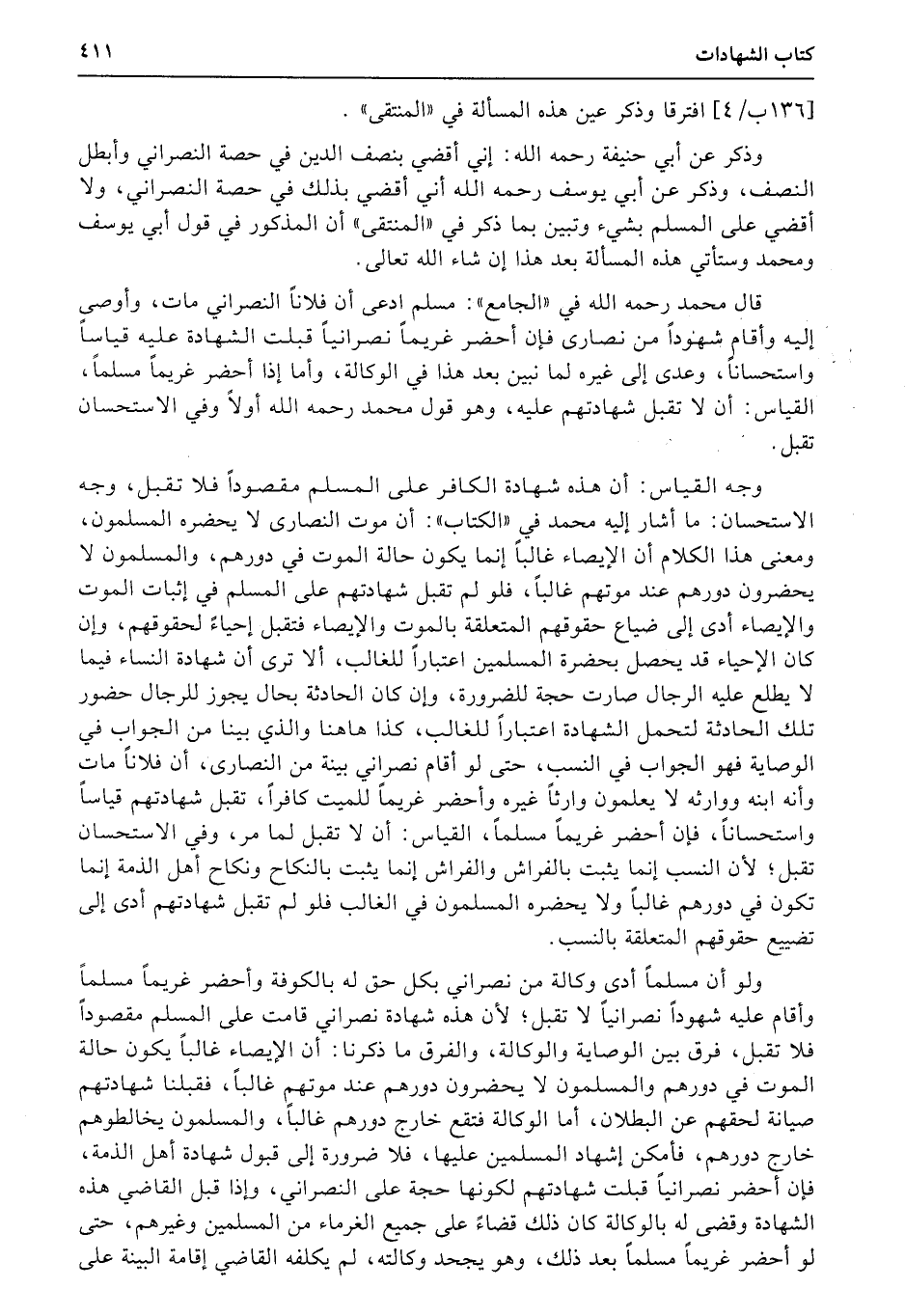 وذكر عن أبي حنيفة رحمه الله: إني أقضي بنصف الدين في حصة النصراني وأبطل النصف، وذكر عن أبي يوسف رحمه الله أني أقضي بذلك في حصة النصراني، ولا أقضي على المسلم بشيء وتبين بما ذكر في «المنتقى» أن المذكور في قول أبي يوسف ومحمد وستأتي هذه المسألة بعد هذا إن شاء الله تعالى.