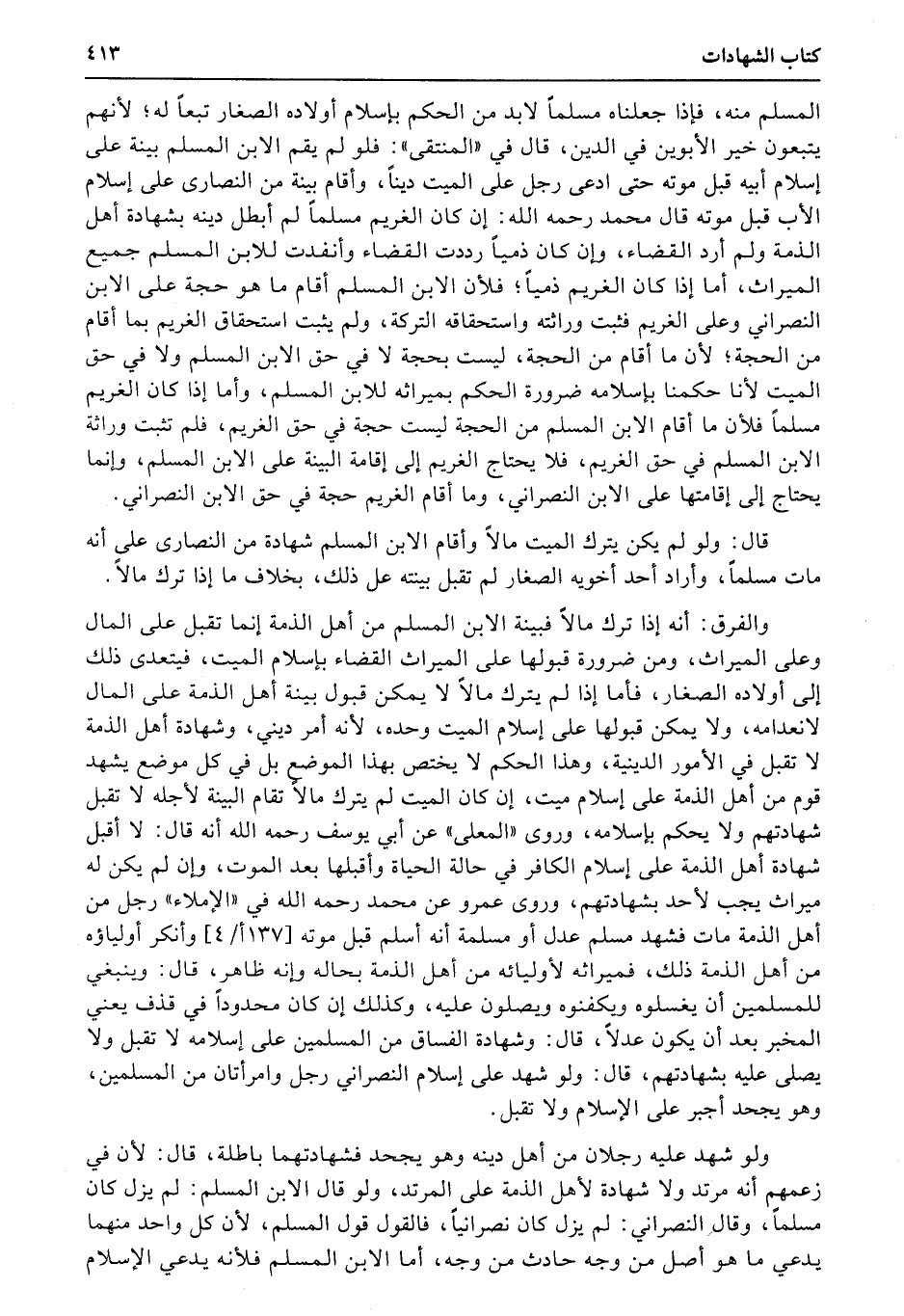 المسلم منه، فإذا جعلناه مسلماً لابد من الحكم بإسلام أولاده الصغار تبعاً له؛ لأنهم يتبعون خير الأبوين في الدين، قال في «المنتقى» : فلو لم يقم الابن المسلم بينة على إسلام أبيه قبل موته حتى ادعى رجل على الميت ديناً، وأقام بينة من النصارى على إسلام الأب قبل موته قال محمد رحمه الله: إن كان الغريم مسلماً لم أبطل دينه بشهادة أهل الذمة ولم أرد القضاء، وإن كان ذمياً رددت القضاء وأنفدت للابن المسلم جميع الميراث، أما إذا كان الغريم ذمياً؛ فلأن الابن المسلم أقام ما هو حجة على الابن النصراني وعلى الغريم فثبت وراثته واستحقاقه التركة، ولم يثبت استحقاق الغريم بما أقام من الحجة؛ لأن ما أقام من الحجة، ليست بحجة لا في حق الابن المسلم ولا في حق الميت لأنا حكمنا بإسلامه ضرورة الحكم بميراثه للابن المسلم، وأما إذا كان الغريم مسلما فلأن ما أقام الابن المسلم من الحجة ليست حجة في حق الغريم، فلم تثبت وراثة الابن المسلم في حق الغريم، فلا يحتاج الغريم إلى إقامة البينة على الابن المسلم، وإنما يحتاج إلى إقامتها على الابن النصراني، وما أقام الغريم حجة في حق الابن النصراني.a