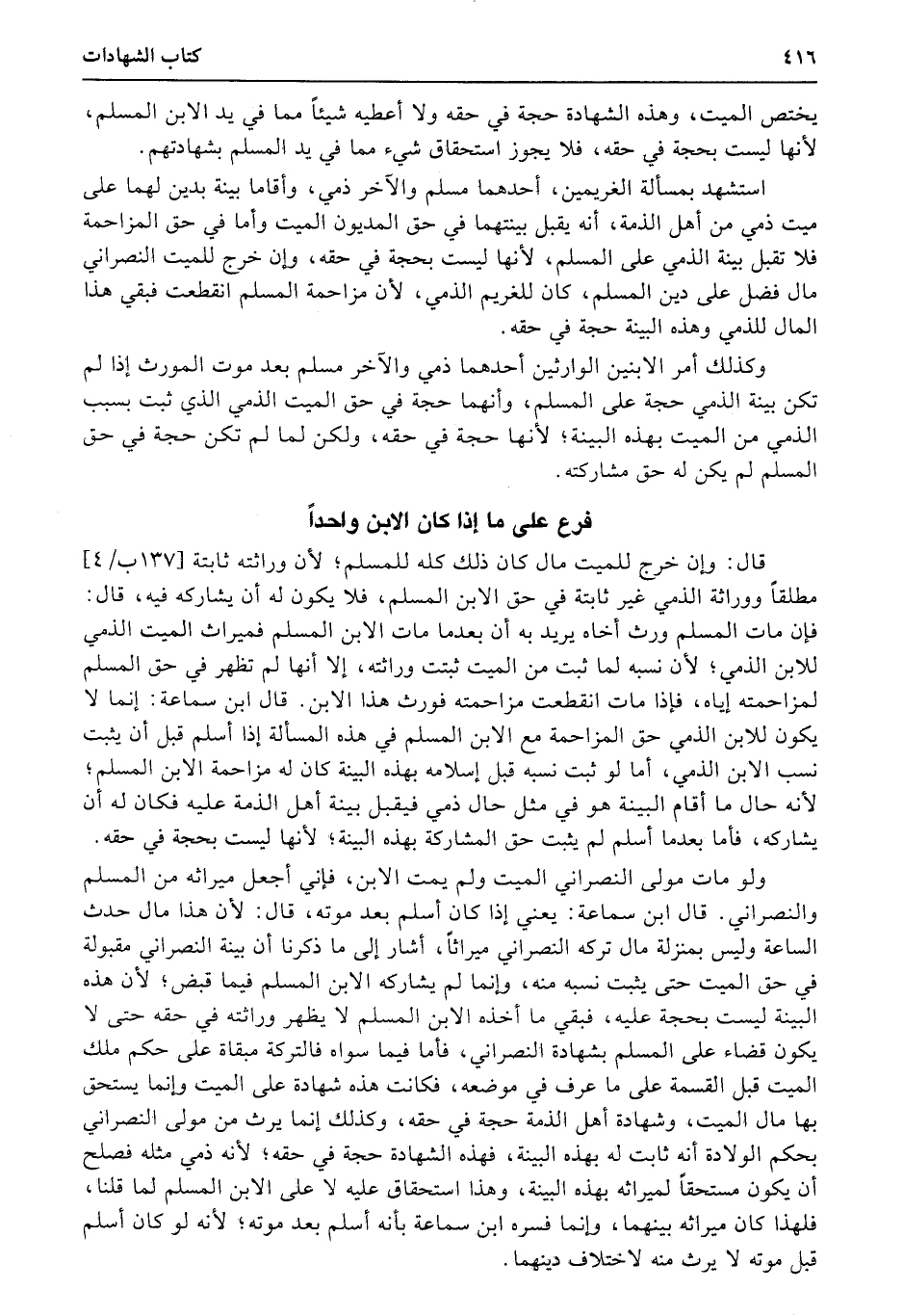 وكذلك أمر الابنين الوارثين أحدهما ذمي والآخر مسلم بعد موت المورث إذا لم تكن بينة الذمي حجة على المسلم، وأنهما حجة في حق الميت الذمي الذي ثبت بسبب الذمي من الميت بهذه البينة؛ لأنها حجة في حقه، ولكن لما لم تكن حجة في حق المسلم لم يكن له حق مشاركته.