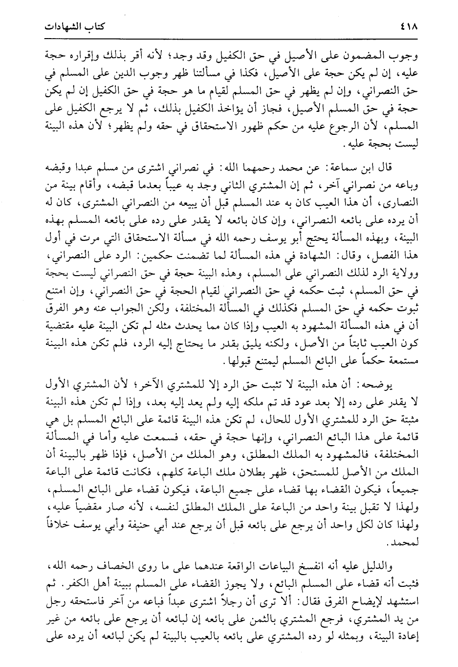 قال ابن سماعة: عن محمد رحمهما الله: في نصراني اشترى من مسلم عبدا وقبضه وباعه من نصراني آخر، ثم إن المشتري الثاني وجد به عيباً بعدما قبضه، وأقام بينة من النصارى، أن هذا العيب كان به عند المسلم قبل أن يبيعه من النصراني المشترى، كان له أن يرده على بائعه النصراني، وإن كان بائعه لا يقدر على رده على بائعه المسلم بهذه البينة، وبهذه المسألة يحتج أبو يوسف رحمه الله في مسألة الاستحقاق التي مرت في أول هذا الفصل، وقال: الشهادة في هذه المسألة لما تضمنت حكمين: الرد على النصراني، وولاية الرد لذلك النصراني على المسلم، وهذه البينة حجة في حق النصراني ليست بحجة في حق المسلم، ثبت حكمه في حق النصراني لقيام الحجة في حق النصراني، وإن امتنع ثبوت حكمه في حق المسلم فكذلك في المسألة المختلفة، ولكن الجواب عنه وهو الفرق أن في هذه المسألة المشهود به العيب وإذا كان مما يحدث مثله لم تكن البينة عليه مقتضية كون العيب ثابتاً من الأصل، ولكنه يليق بقدر ما يحتاج إليه الرد، فلم تكن هذه البينة مستمعة حكماً على البائع المسلم ليمتنع قبولها.
