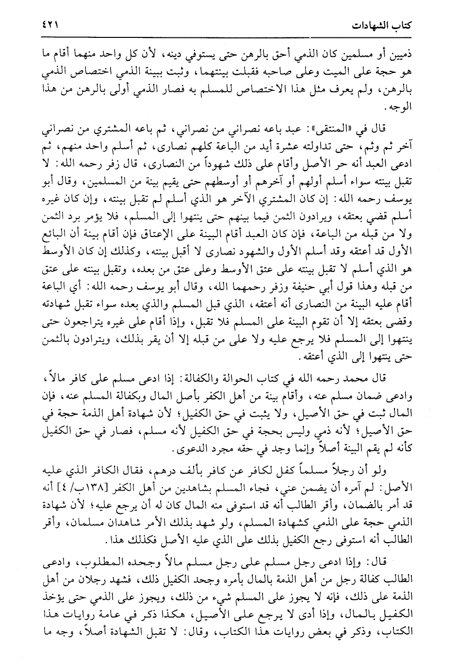 قال: وإذا ادعى رجل مسلم على رجل مسلم مالاً وجحده المطلوب، وادعى الطالب كفالة رجل من أهل الذمة بالمال بأمره وجحد الكفيل ذلك، فشهد رجلان من أهل الذمة على ذلك، فإنه لا يجوز على المسلم شيء من ذلك، ويجوز على الذمي حتى يؤخذ الكفيل بالمال، وإذا أدى لا يرجع على الأصيل، هكذا ذكر في عامة روايات هذا الكتاب، وذكر في بعض روايات هذا الكتاب، وقال: لا تقبل الشهادة أصلاً، وجه ما