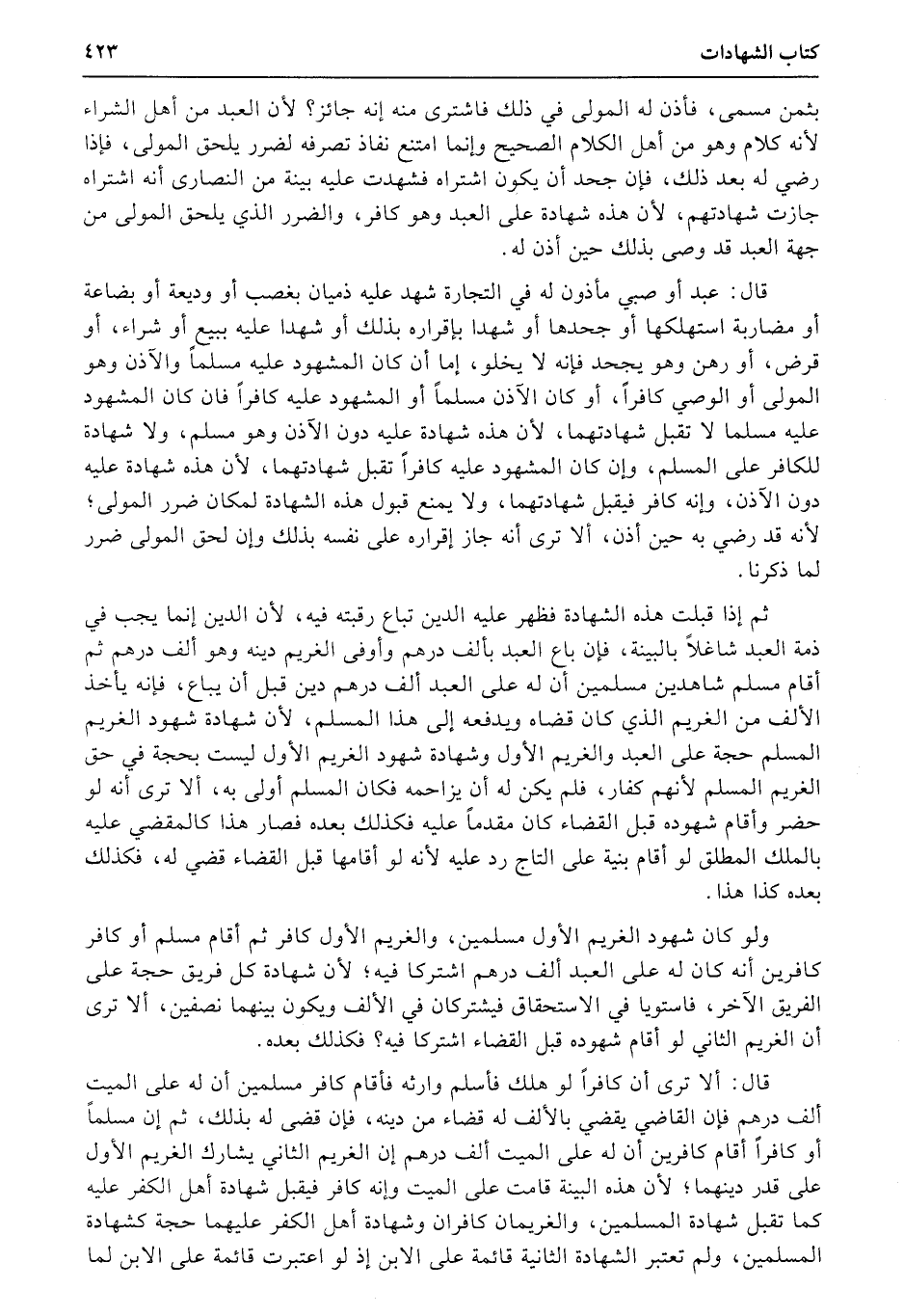 قال: عبد أو صبي مأذون له في التجارة شهد عليه ذميان بغصب أو وديعة أو بضاعة أو مضاربة استهلكها أو جحدها أو شهدا بإقراره بذلك أو شهدا عليه ببيع أو شراء، أو قرض، أو رهن وهو يجحد فإنه لا يخلو، إما أن كان المشهود عليه مسلماً والآذن وهو المولى أو الوصي كافراً، أو كان الآذن مسلماً أو المشهود عليه كافراً فان كان المشهود عليه مسلما لا تقبل شهادتهما، لأن هذه شهادة عليه دون الآذن وهو مسلم، ولا شهادة للكافر على المسلم، وإن كان المشهود عليه كافراً تقبل شهادتهما، لأن هذه شهادة عليه دون الآذن، وإنه كافر فيقبل شهادتهما، ولا يمنع قبول هذه الشهادة لمكان ضرر المولى؛ لأنه قد رضي به حين أذن، ألا ترى أنه جاز إقراره على نفسه بذلك وإن لحق المولى ضرر لما ذكرنا.