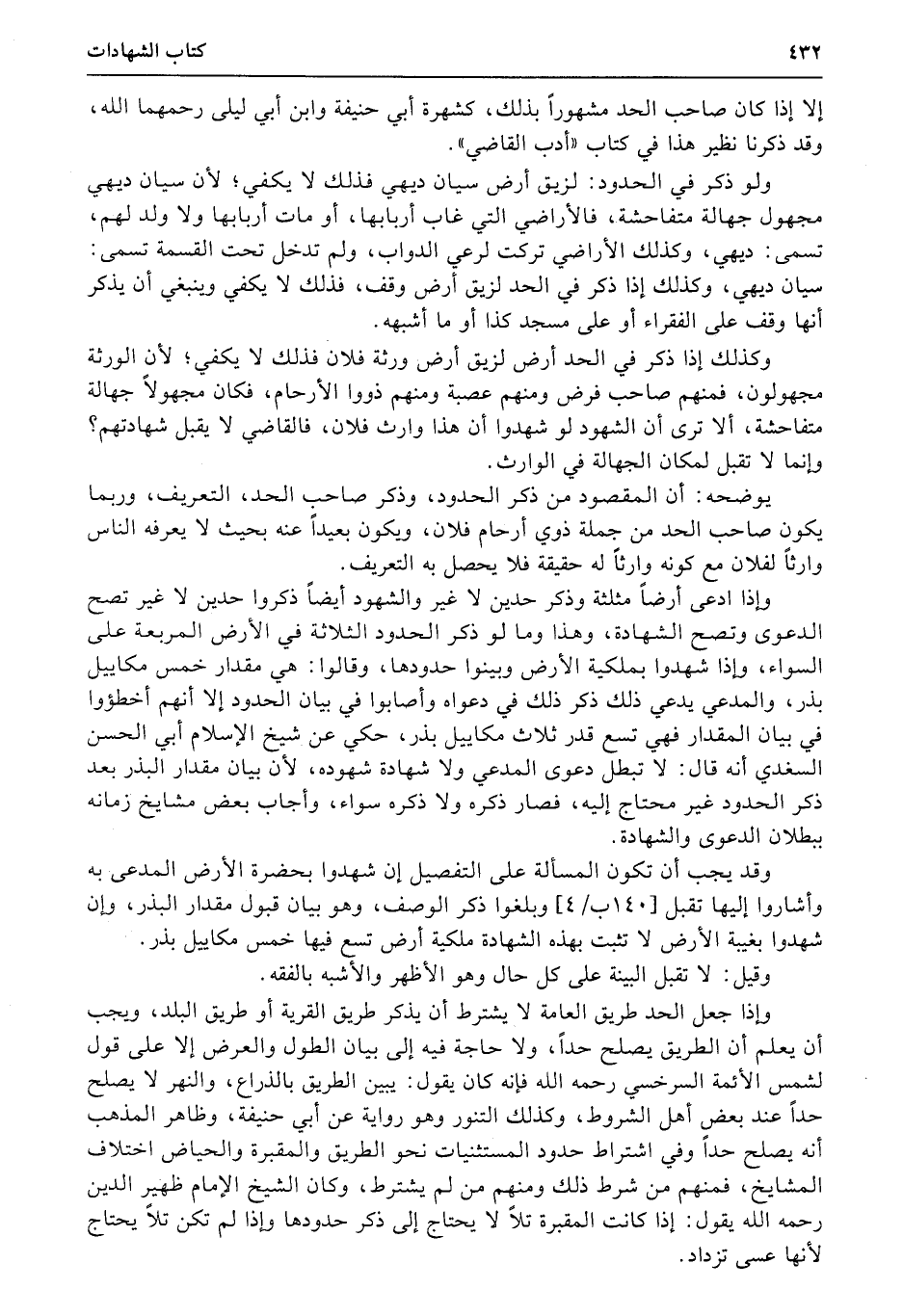 وقد يجب أن تكون المسألة على التفصيل إن شهدوا بحضرة الأرض المدعى به وأشاروا إليها تقبل (140ب4) وبلغوا ذكر الوصف، وهو بيان قبول مقدار البذر، وإن شهدوا بغيبة الأرض لا تثبت بهذه الشهادة ملكية أرض تسع فيها خمس مكاييل بذر.