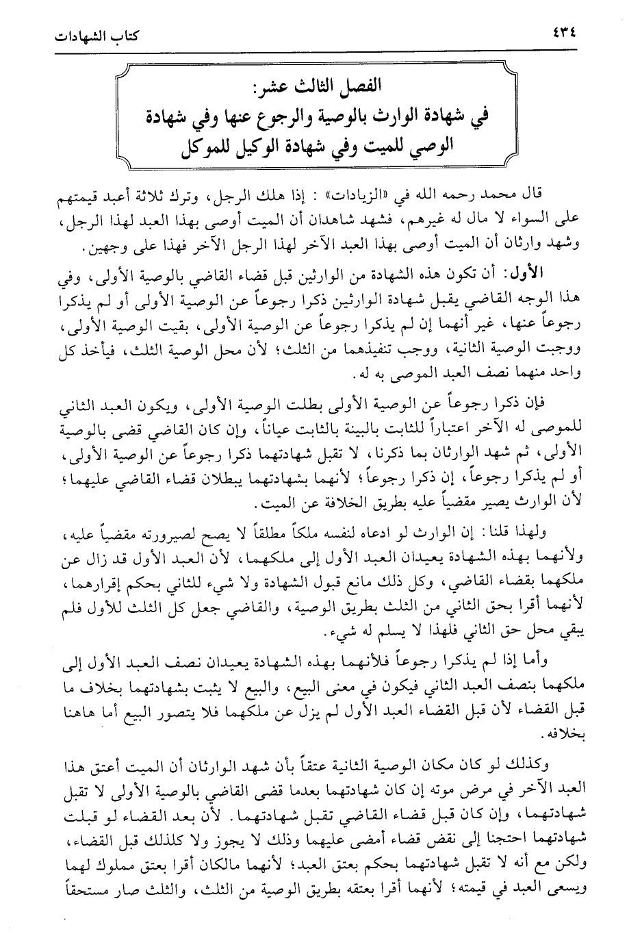 الفصل الثالث عشر: في شهادة الوارث بالوصية والرجوع عنها وفي شهادةالوصي للميت وفي شهادة الوكيل للموكل