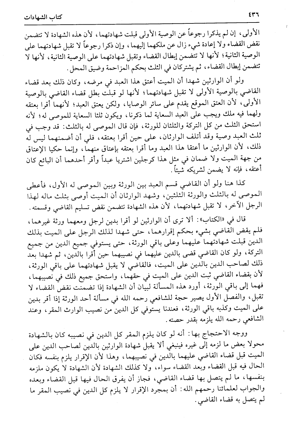 ووجه الاحتجاج بها: أنه لو كان يلزم المقر كل الدين في نصيبه كان بالشهادة محولا بعض ما لزمه إلى غيره فينبغي ألا يقبل شهادة الوارثين بالدين لصاحب الدين على الميت قبل قضاء القاضي عليهما بالدين في نصيبهما، وهذا لأن الإقرار يلزم بنفسه فكان الحال فيه قبل القضاء وبعد القضاء سواء، ولا كذلك الشهادة لأن الشهادة لا يكون ملزمه بنفسها، ما لم يتصل بها قضاء القاضي، فجاز أن يفرق الحال فيها قبل القضاء وبعده والجواب لعلمائنا رحمهم الله: أن بمجرد الإقرار لا يلزم كل الدين في نصيب المقر ما لم يتصل به قضاء القاضي.