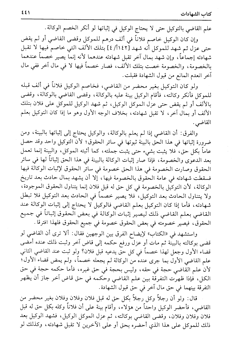 واستشهد في «الكتاب» لإيضاح الفرق بين الوجهين فقال: ألا ترى أن القاضي لو قضى بوكالته بالبينة ثم مات أو عزل ورفع حكمه إلى قاض آخر وثبت ذلك عنده أمضى قضاء الأول وجعل لهذا خصماً في كل حق يدعيه قبل فلان؟ ولو ثبت عند القاضي الثاني علم القاضي الأول بما جرى عنده من الوكالة لم يجعله خصماً، ولم يمض قضاء الأول؛ لأن علم القاضي حجة في حقه، وليس بحجة في حق غيره، فأما حكمه حجة في حق الكل، فإذا ظهرت التفرقة بين علم القاضي وحكمه في حق قاض آخر جاز أن يظهر التفرقة بينهما في حق مال آخر في حق قبول الشهادة.