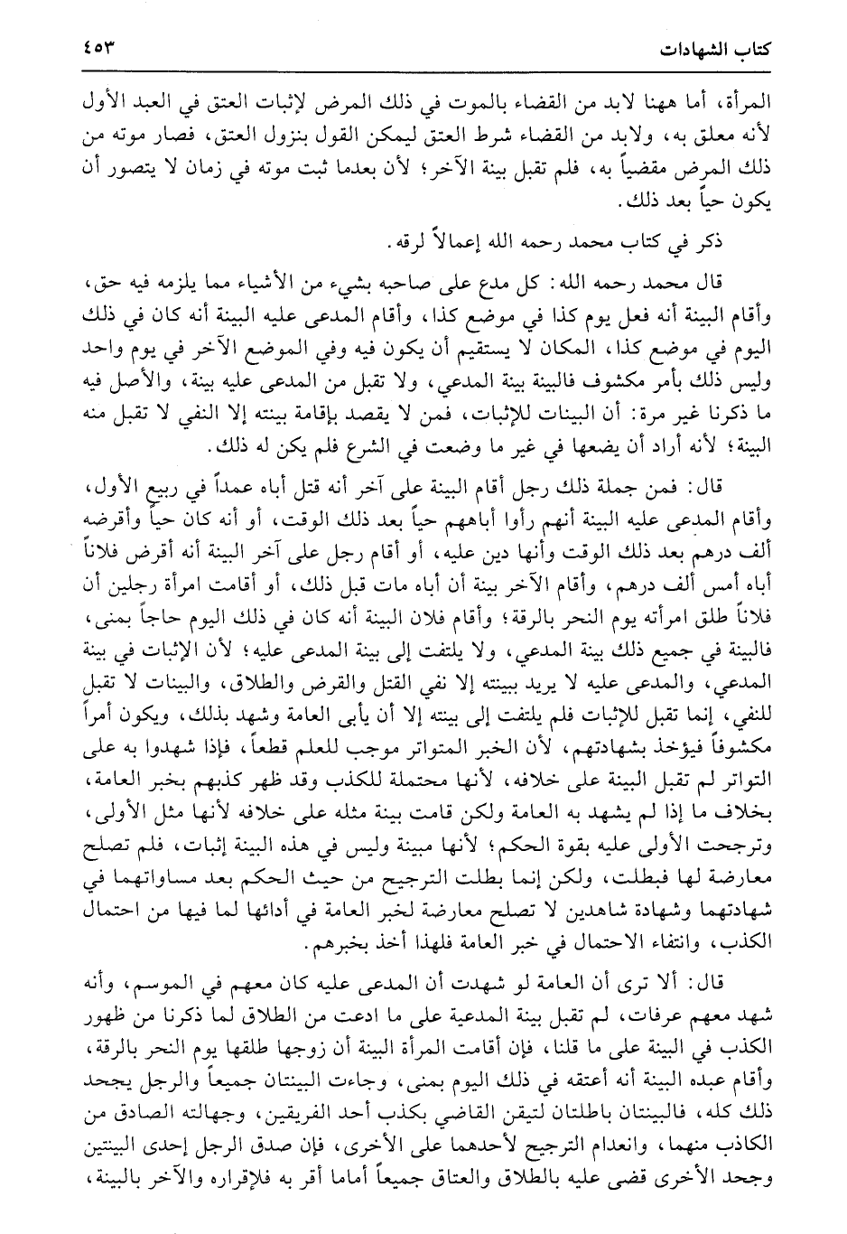 قال: ألا ترى أن العامة لو شهدت أن المدعى عليه كان معهم في الموسم، وأنه شهد معهم عرفات، لم تقبل بينة المدعية على ما ادعت من الطلاق لما ذكرنا من ظهور الكذب في البينة على ما قلنا، فإن أقامت المرأة البينة أن زوجها طلقها يوم النحر بالرقة، وأقام عبده البينة أنه أعتقه في ذلك اليوم بمنى، وجاءت البينتان جميعاً والرجل يجحد ذلك كله، فالبينتان باطلتان لتيقن القاضي بكذب أحد الفريقين، وجهالته الصادق من الكاذب منهما، وانعدام الترجيح لأحدهما على الأخرى، فإن صدق الرجل إحدى البينتين وجحد الأخرى قضى عليه بالطلاق والعتاق جميعاً أماما أقر به فلإقراره والآخر بالبينة،