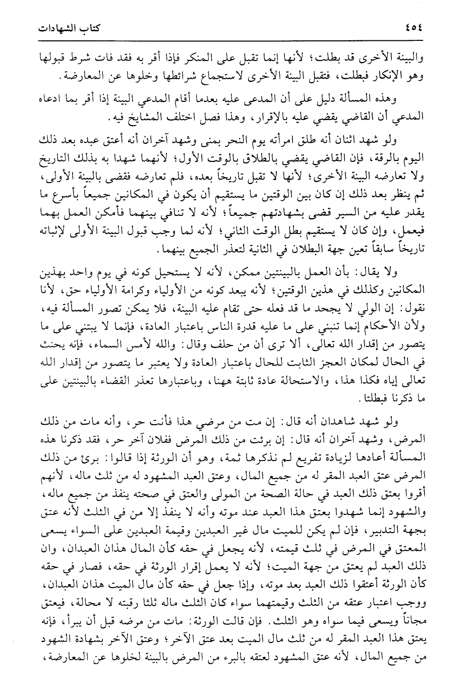 ولو شهد اثنان أنه طلق امرأته يوم النحر بمنى وشهد آخران أنه أعتق عبده بعد ذلك اليوم بالرقة، فإن القاضي يقضي بالطلاق بالوقت الأول؛ لأنهما شهدا به بذلك التاريخ ولا تعارضه البينة الأخرى؛ لأنها لا تقبل تاريخاً بعده، فلم تعارضه فقضى بالبينة الأولى، ثم ينظر بعد ذلك إن كان بين الوقتين ما يستقيم أن يكون في المكانين جميعاً بأسرع ما يقدر عليه من السير قضى بشهادتهم جميعاً؛ لأنه لا تنافي بينهما فأمكن العمل بهما فيعمل، وإن كان لا يستقيم بطل الوقت الثاني؛ لأنه لما وجب قبول البينة الأولى لإثباته تاريخاً سابقاً تعين جهة البطلان في الثانية لتعذر الجميع بينهما.