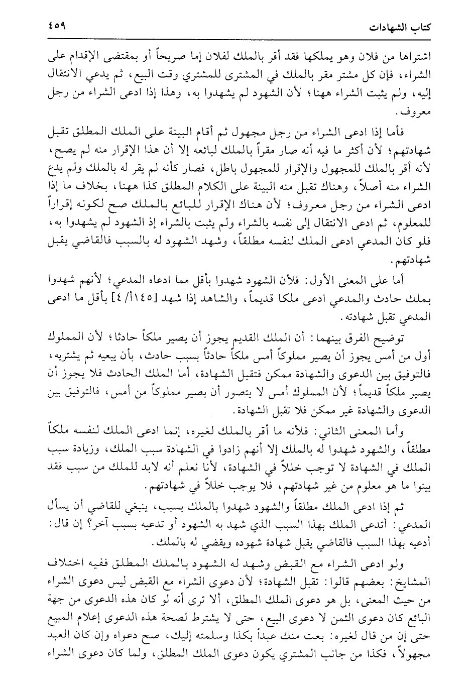 ولو ادعى الشراء مع القبض وشهد له الشهود بالملك المطلق ففيه اختلاف المشايخ: بعضهم قالوا: تقبل الشهادة؛ لأن دعوى الشراء مع القبض ليس دعوى الشراء من حيث المعنى، بل هو دعوى الملك المطلق، ألا ترى أنه لو كان هذه الدعوى من جهة البائع كان دعوى الثمن لا دعوى البيع، حتى لا يشترط لصحة هذه الدعوى إعلام المبيع حتى إن من قال لغيره: بعت منك عبداً بكذا وسلمته إليك، صح دعواه وإن كان العبد مجهولاً، فكذا من جانب المشتري يكون دعوى الملك المطلق، ولما كان دعوى الشراء