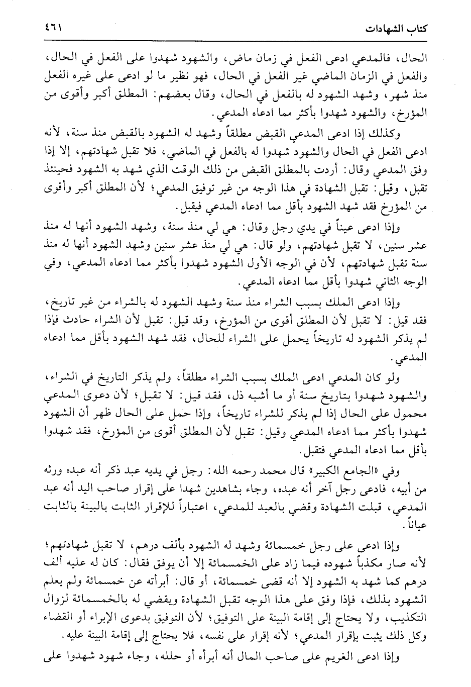 الحال، فالمدعي ادعى الفعل في زمان ماض، والشهود شهدوا على الفعل في الحال، والفعل في الزمان الماضي غير الفعل في الحال، فهو نظير ما لو ادعى على غيره الفعل منذ شهر، وشهد الشهود له بالفعل في الحال، وقال بعضهم: المطلق أكبر وأقوى من المؤرخ، والشهود شهدوا بأكثر مما ادعاه المدعي.