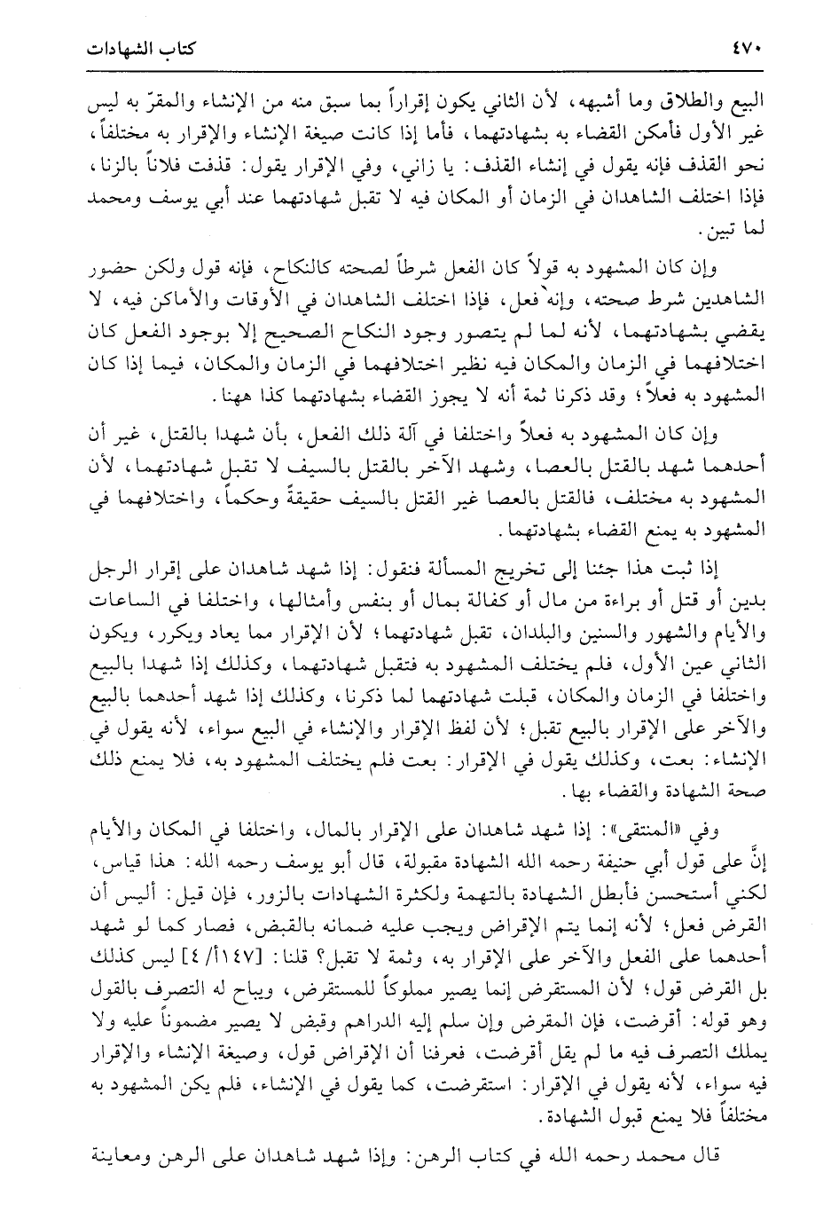 البيع والطلاق وما أشبهه، لأن الثاني يكون إقراراً بما سبق منه من الإنشاء والمقرّ به ليس غير الأول فأمكن القضاء به بشهادتهما، فأما إذا كانت صيغة الإنشاء والإقرار به مختلفاً، نحو القذف فإنه يقول في إنشاء القذف: يا زاني، وفي الإقرار يقول: قذفت فلاناً بالزنا، فإذا اختلف الشاهدان في الزمان أو المكان فيه لا تقبل شهادتهما عند أبي يوسف ومحمد لما تبين.t