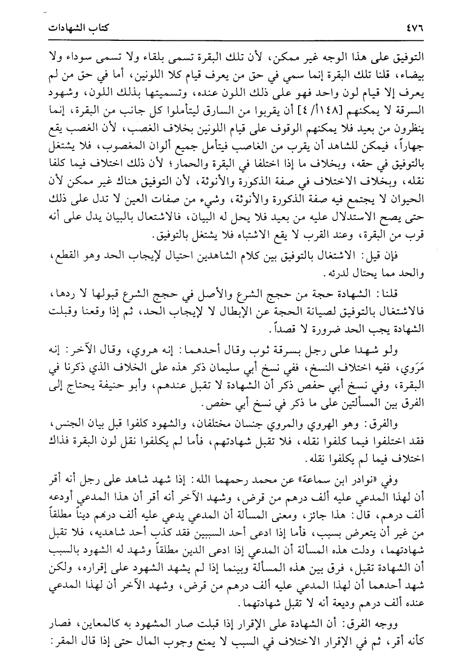 والفرق: وهو الهروي والمروي جنسان مختلفان، والشهود كلفوا قبل بيان الجنس، فقد اختلفوا فيما كلفوا نقله، فلا تقبل شهادتهم، فأما لم يكلفوا نقل لون البقرة فذاك اختلاف فيما لم يكلفوا نقله.
