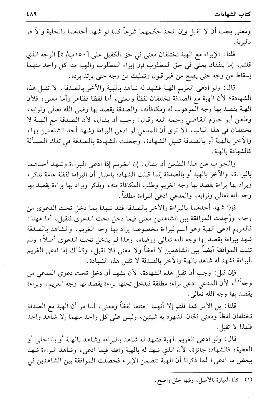 فإذا شهد أحدهما بالبراءة والآخر بالصدقة فقد شهدا بما دخل تحت الدعوى من وجه، ووُجِدت الموافقة بين الشاهدين معنى فيما دخل تحت الدعوى فتقبل، أما ههنا: فالغريم ادعى الهبة وهو اسم لبراءة مخصوصة يراد بها وجه الغريم، والشاهد بالصدقة شهد ببراءة يقصد بها وجه الله تعالى ورضاه، وهذا لم يدخل تحت الدعوى أصلاً، ولم تثبت الموافقة أيضاً بين الشاهدين لا لفظاً ولا معنى فلا تقبل، وكذلك إذا ادعى الغريم البراءة فشهد له شاهد بالهبة والآخر بالصدقة لا تقبل هذه الشهادة.