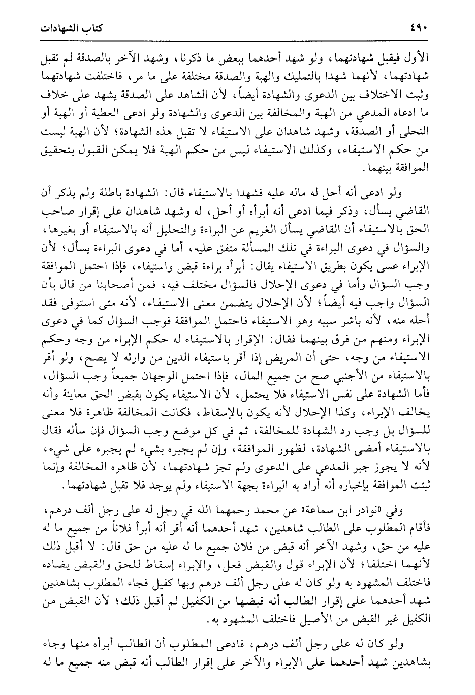 وفي «نوادر ابن سماعة» عن محمد رحمهما الله في رجل له على رجل ألف درهم، فأقام المطلوب على الطالب شاهدين، شهد أحدهما أنه أقر أنه أبرأ فلاناً من جميع ماله عليه من حق، وشهد الآخر أنه قبض من فلان جميع ماله عليه من حق قال: لا أقبل ذلك لأنهما اختلفا؛ لأن الإبراء قول والقبض فعل، والإبراء إسقاط للحق والقبض يضاده فاختلف المشهود به ولو كان له على رجل ألف درهم وبها كفيل فجاء المطلوب بشاهدين شهد أحدهما على إقرار الطالب أنه قبضها من الكفيل لم أقبل ذلك؛ لأن القبض من الكفيل غير القبض من الأصيل فاختلف المشهود به.