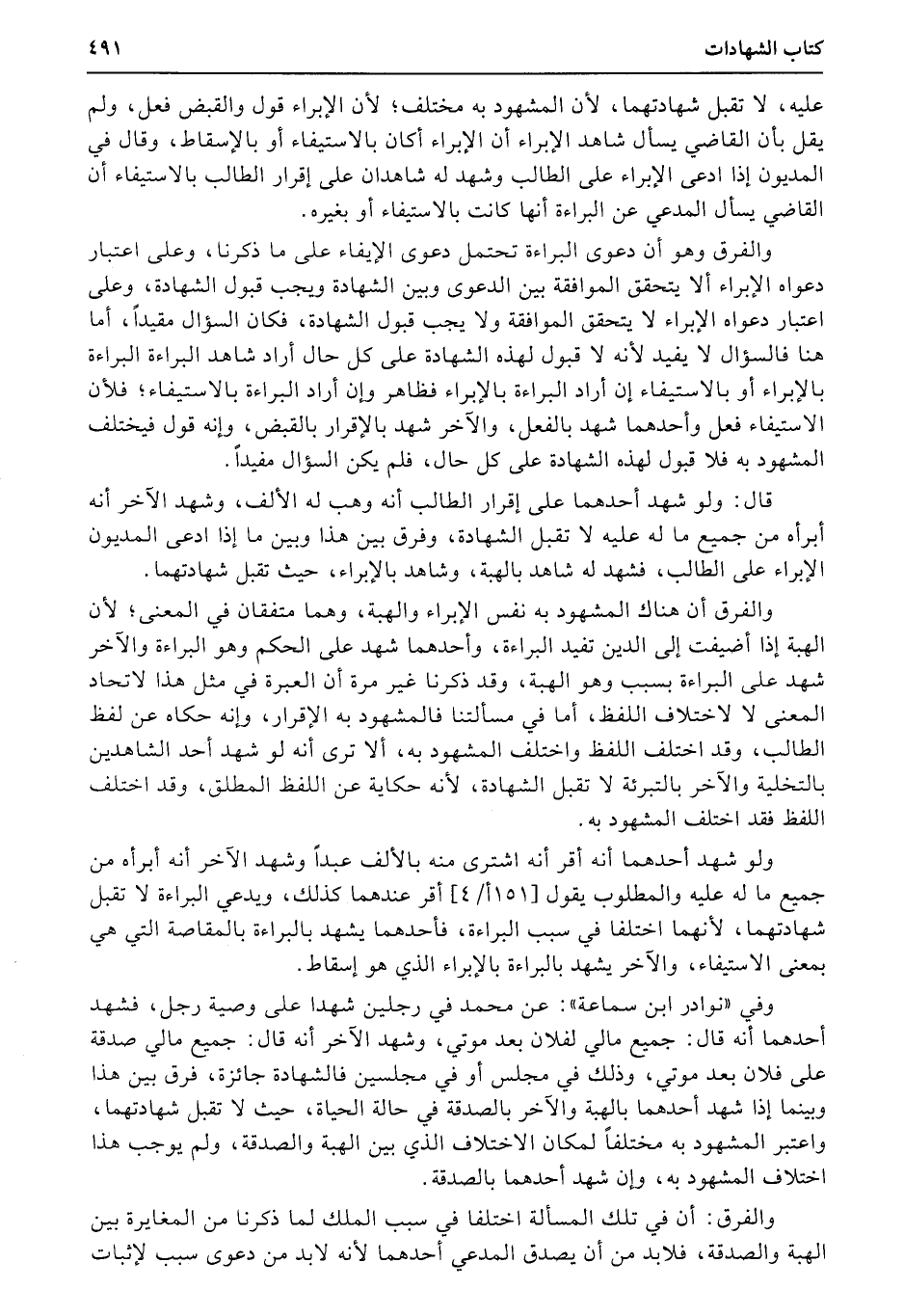عليه، لا تقبل شهادتهما، لأن المشهود به مختلف؛ لأن الإبراء قول والقبض فعل، ولم يقل بأن القاضي يسأل شاهد الإبراء أن الإبراء أكان بالاستيفاء أو بالإسقاط، وقال في المديون إذا ادعى الإبراء على الطالب وشهد له شاهدان على إقرار الطالب بالاستيفاء أن القاضي يسأل المدعي عن البراءة أنها كانت بالاستيفاء أو بغيره.