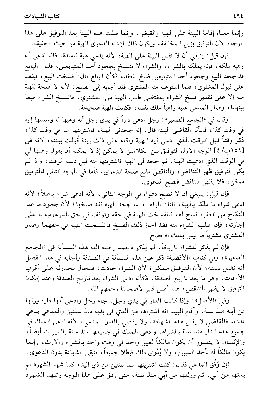 وإنما معناه إقامة البينة على الهبة والقبض، وإنما قبلت هذه البينة بعد التوفيق على هذا الوجه؛ لأن التوفيق يزيل المخالفة، ويكون ذلك ابتداء الدعوى الهبة من حيث الحقيقة.