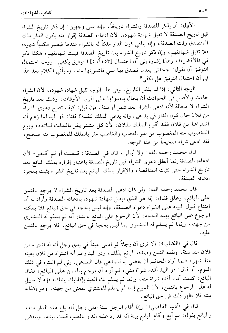 الأول: أن يذكر للصدقة والشراء تاريخاً، وإنه على وجهين: إن ذكر تاريخ الشراء قبل تاريخ الصدقة لا تقبل شهادة شهوده، لأن ادعاءه الصدقة إقرار منه بكون الدار ملك المتصدق وقت الصدقة، وإنه ينافي كون الدار ملكاً له بالشراء عندها فيصير مكذباً شهوده فلا تقبل شهادتهم، وإن ذكر تاريخ الشراء بعد تاريخ الصدقة قبلت شهادتهم، هكذا ذكر في «الأقضية» ، وهذا إشارة إلى أن احتمال (153أ4) التوفيق يكفي. ووجه احتمال التوفيق أن يقول: جحدني بعدما تصدق بها علي فاشتريتها منه، وسيأتي الكلام بعد هذا في أن احتمال التوفيق هل يكفي؟.