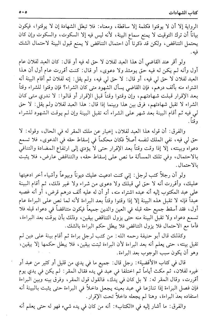 ولو أن رجلاً كتب لرجل: إني كنت ادعيت عليك ديوناً وبيوعاً وأشياء أخر ادعيتها عليك، وأقررت أنه لا حق لي قبلك ولا دعوى من شراء ولا غير ذلك، ثم أقام البينة على عبد المكتوب إليه أنه عبده اشتراه منه، أو أن له عليه ألف درهم قرض، أو أنه غصبه عبداً فإنه لا تقبل هذه البينة إلا إذا وقتوا وقتاً بعد البراءة لأنه لما نص على البراءة عام أول، فقد أسقط جميع حقه قبله في العين والدين جميعاً فيكون متناقضاً في دعواه قبله فلا تسمع دعواه ولا تقبل البينة منه حتى يزول التناقض بيقين، وذلك بأن يوقت بعد البراءة، فأما مع الاحتمال فلا يزول التناقض فلا يبطل حكم البراءة بالشك.